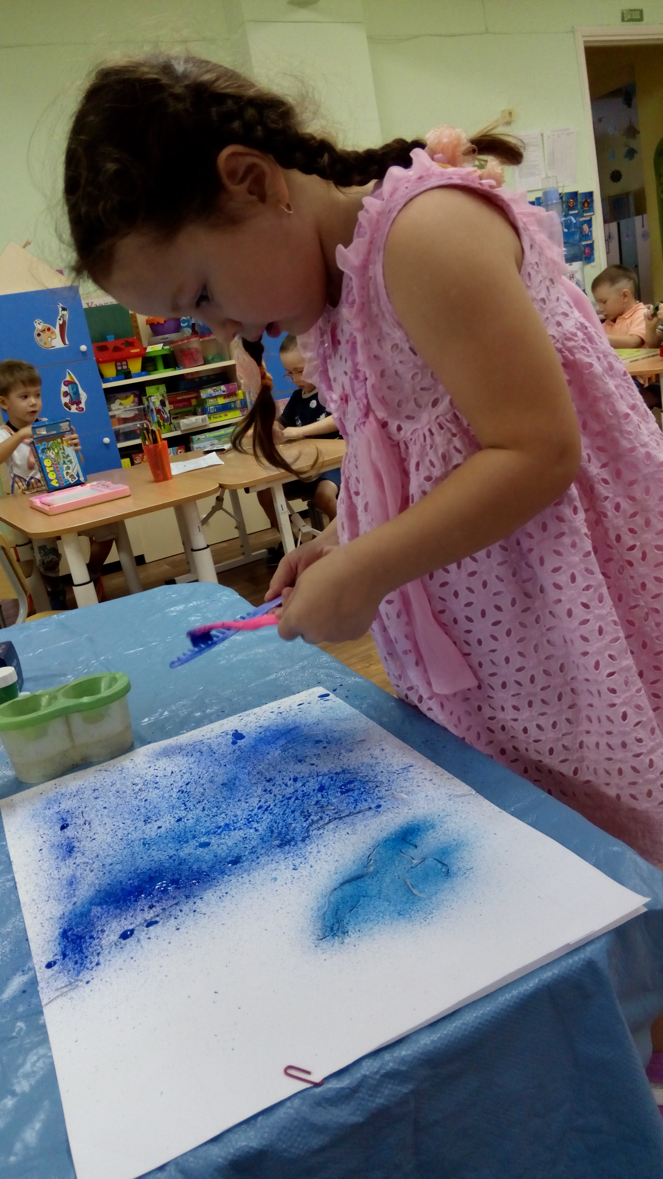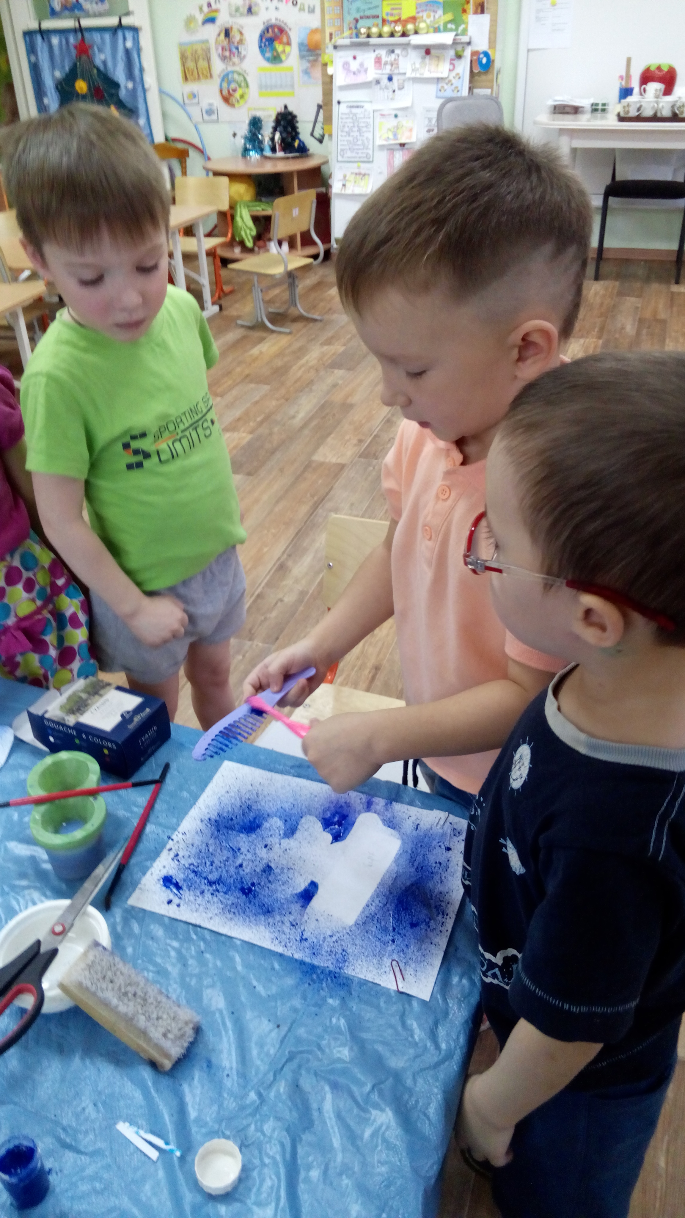 А как прекрасен окружающий мир зимой! Несмотря на то, что всё живое уснуло, природа необыкновенна. И, конечно же, детям средней группы «Звездочка» очень захотелось передать всю красоту в рисунках. Для этого они использовали нетрадиционную технику рисования «Набрызг»- это несложная и интересная техника для творчества. Дети разбрызгивали с помощью зубной щётки и расчёски гуашевую и акварельную краски. После аккуратного удаления верхнего трафарета, дети с восхищением смотрели на результат своей работы! Великолепные, сказочные картины!