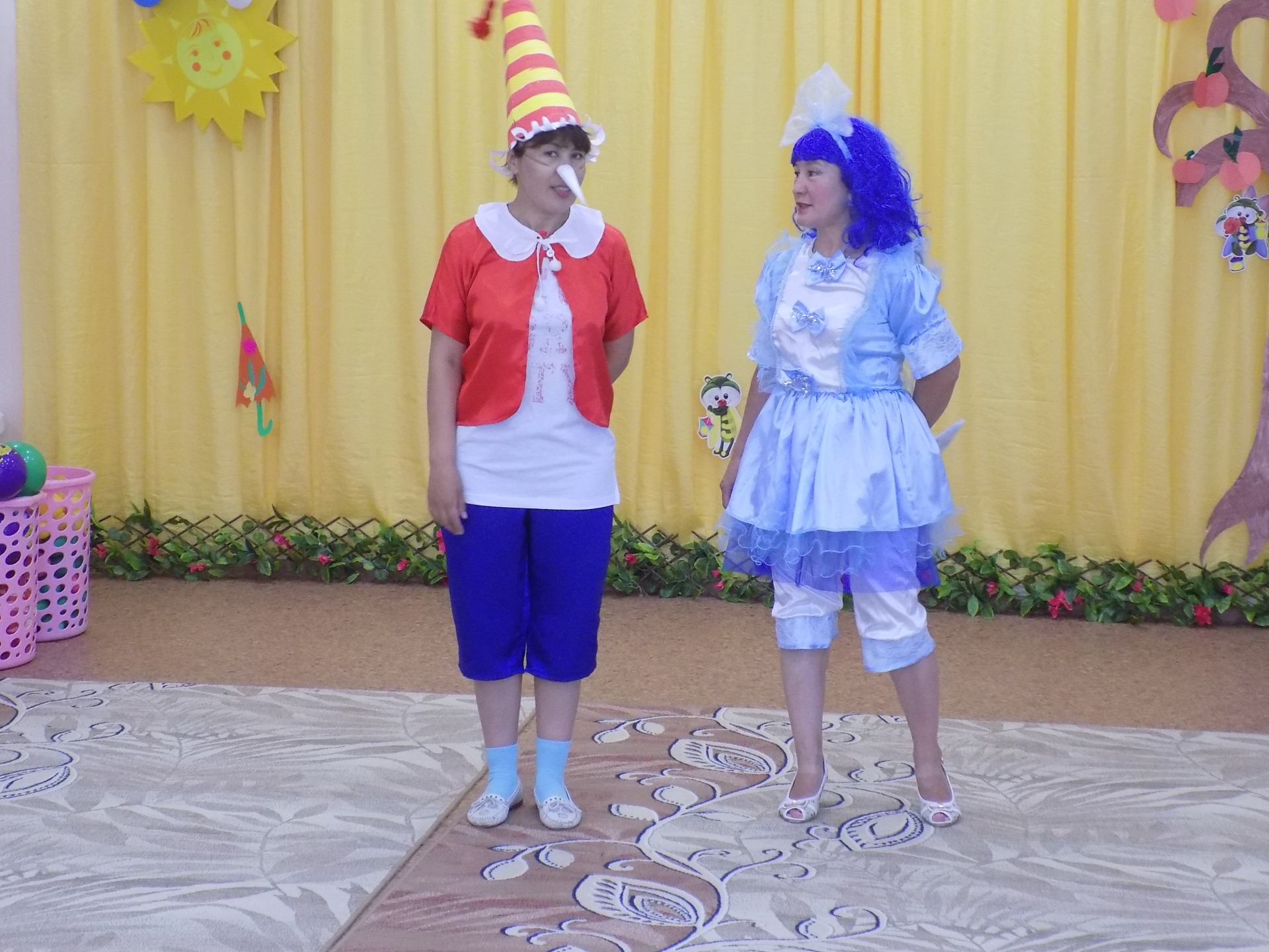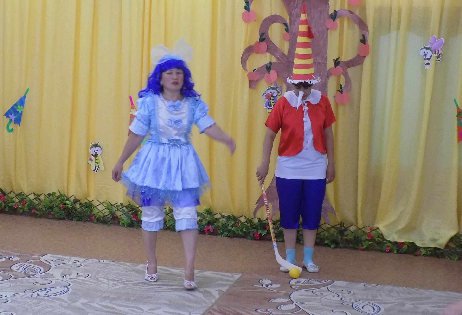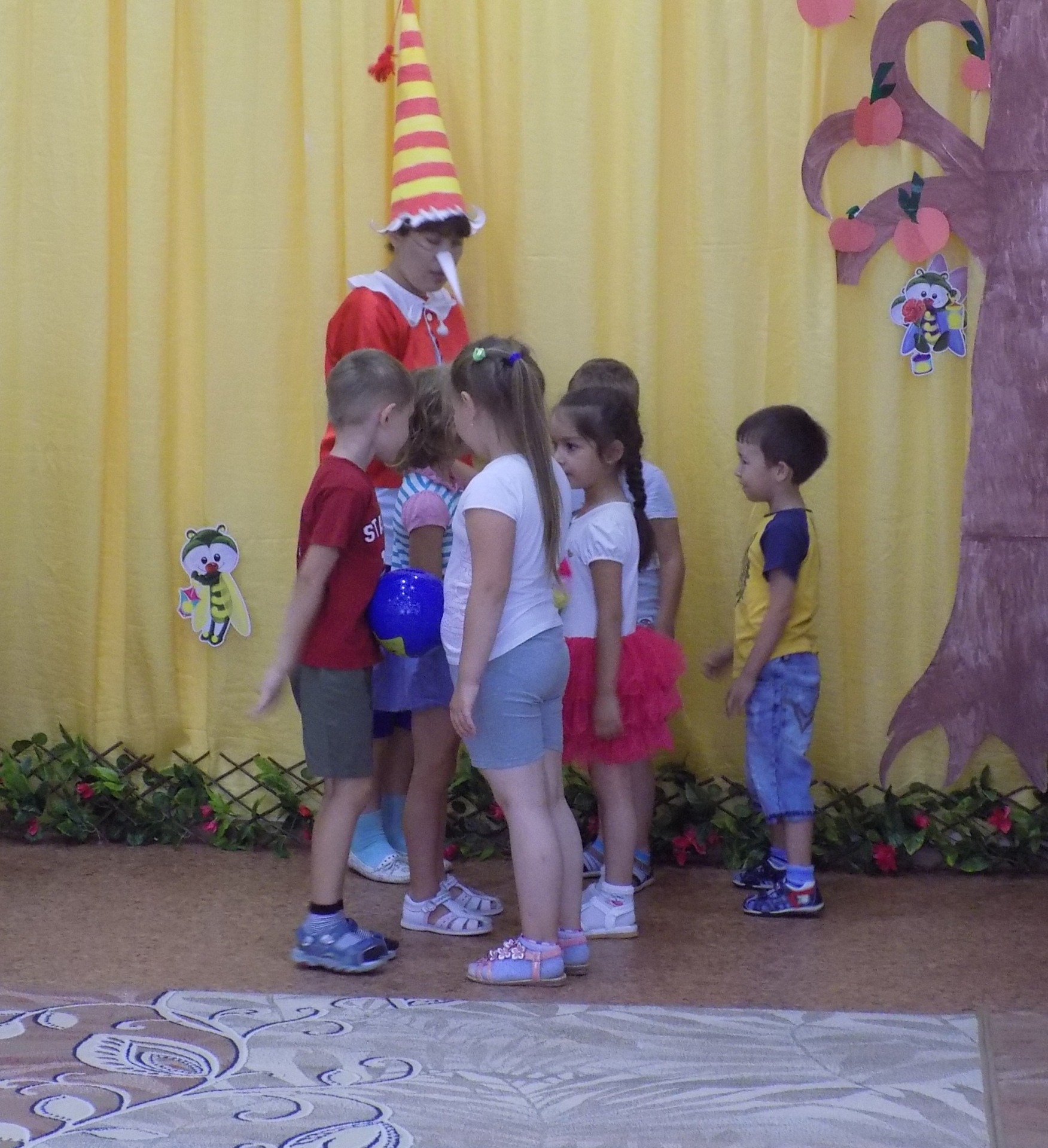 В гости к ребятам пришли сказочные герои Буратино и Мальвина. Они рассказали детям как появился первый мяч, из чего он был сделан.