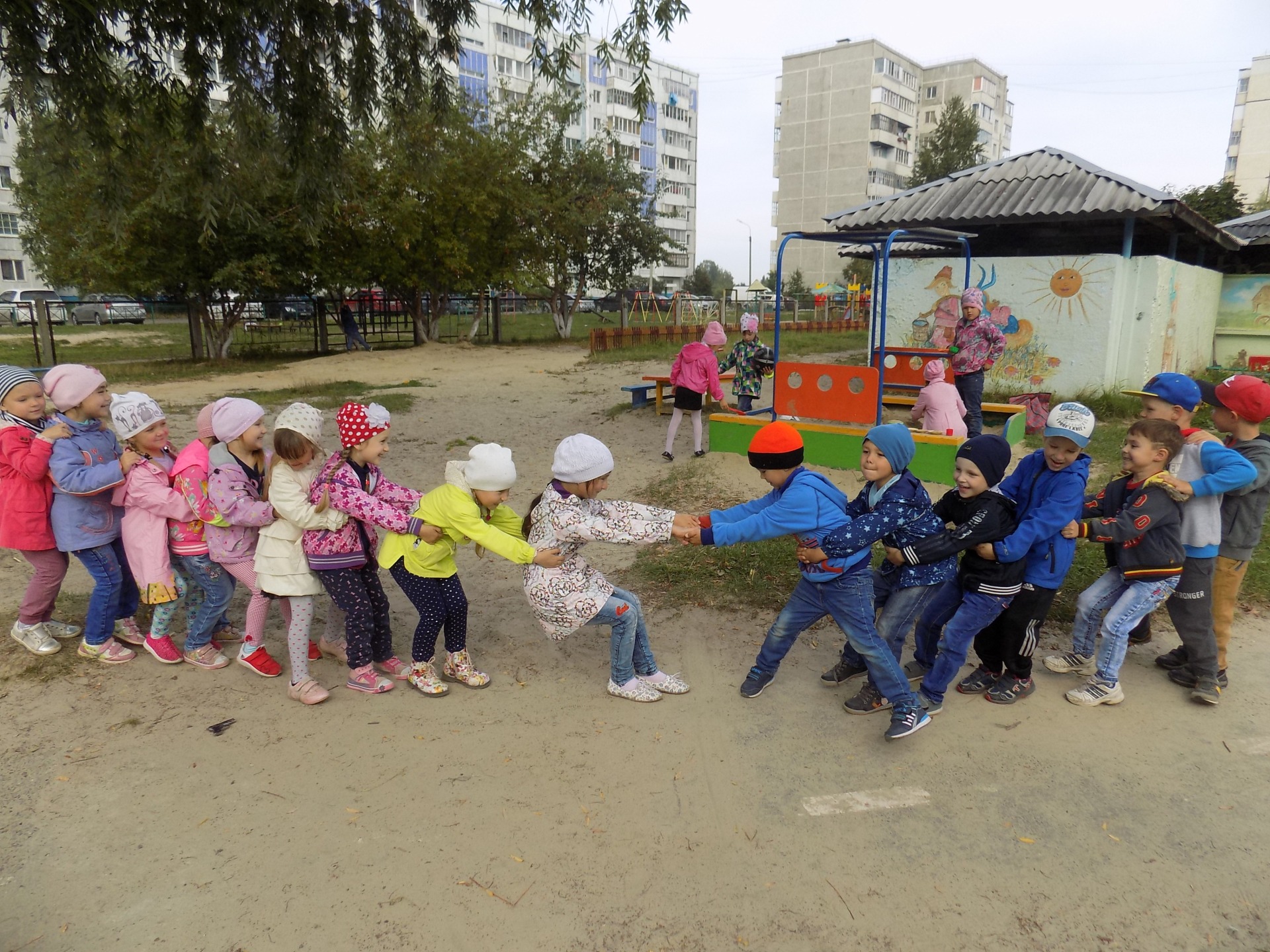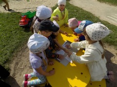 Двигаясь от задания к заданию, ребята собирали кусочки карты. Для этого и рисовали красочные листочки, проползали сквозь поезд, и соревновались в силе «Кто кого перетянет», и проверяли себя на внимательность «Найди заданный предмет на участке»…
