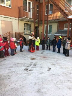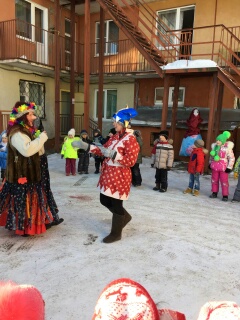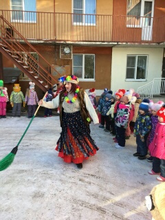 15 марта голос весёлого зазывалы пригласил всех на улицу. Открыл праздник - Скоморох загадал детям загадки. Не обошлось и без проделок Бабы Яги, которая всё время пыталась помешать проведению праздника