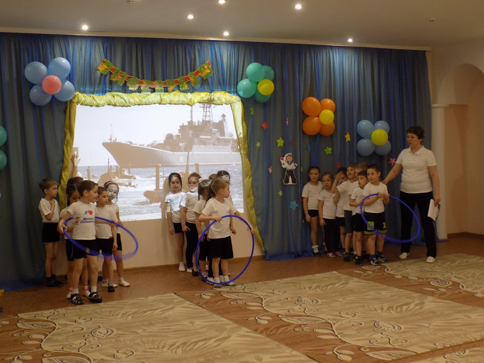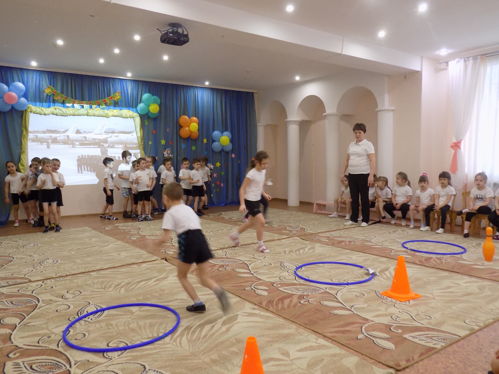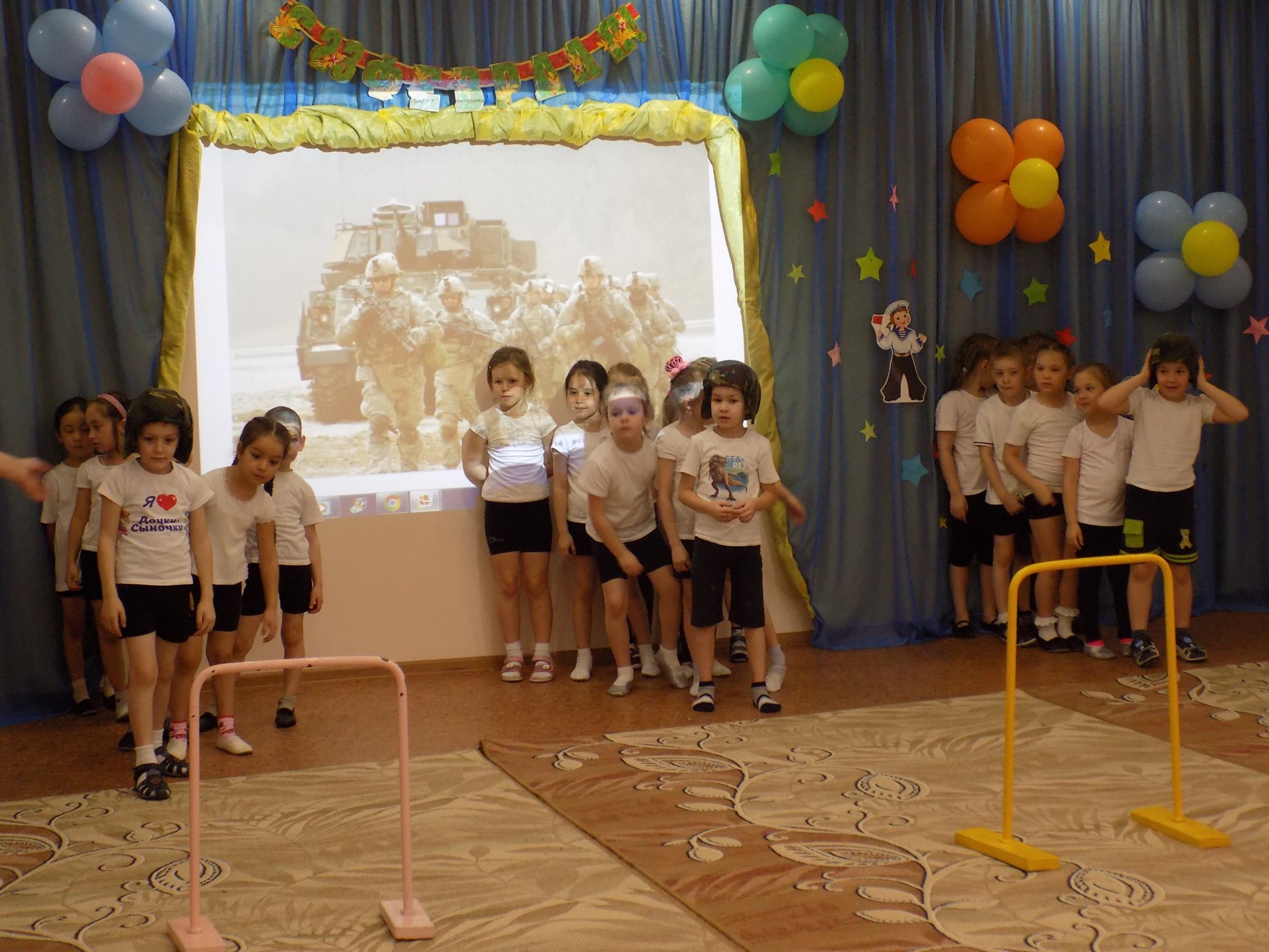 В этот день ребята подготовительных групп «Улыбка», «Непоседы», «Почемучки» пришли в музыкальный зал, чтобы в спортивных состязаниях выявить смелых и отважных, ловких и надёжных мальчиков, которые вырастут и станут защитниками Отечества. Праздник начался с чтения стихов. После стихов был танец «Нано - техно», а дальше самое интересное…