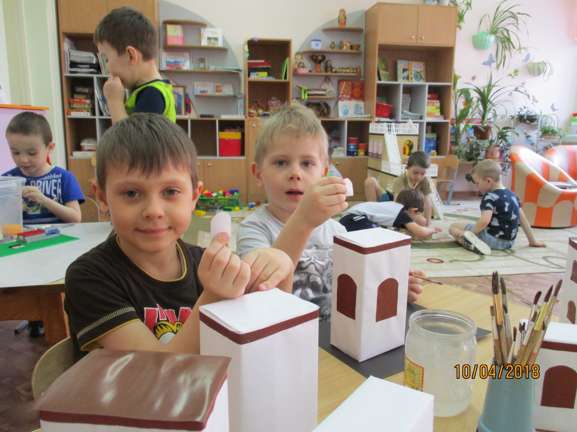 Собрав бросовый материал из коробок, банок и бутылочек, мы стали их обклеивать. Из картона – крыши, из клейкой пленки – купола, и получилась у нас такая красота!