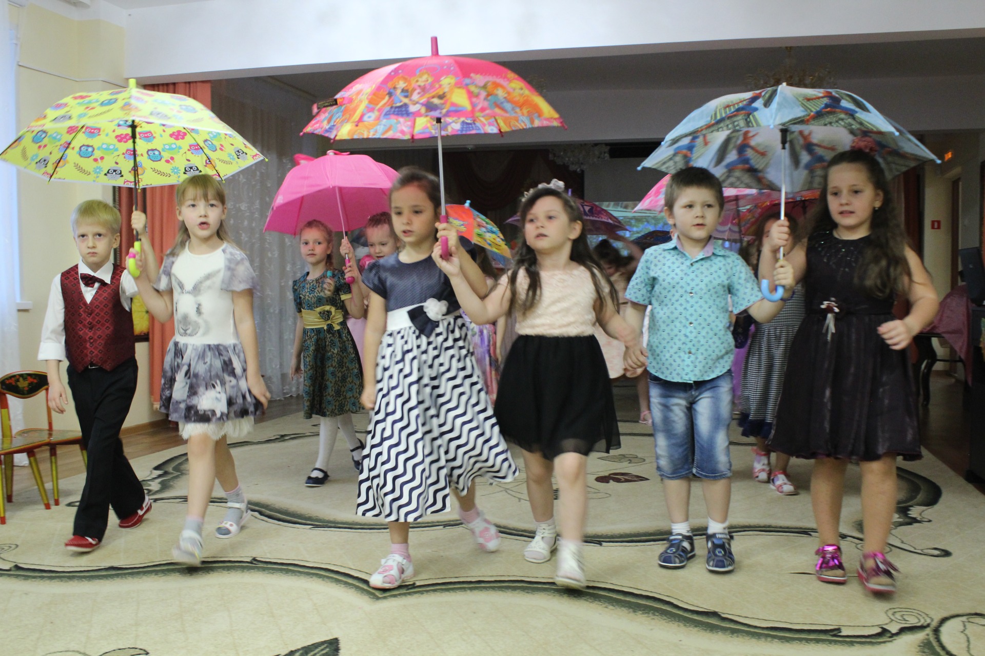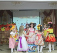 Грибочек, Зайчик, Ежик, Маша и Медведь, развлекали детей вторых младших и средних групп. Все они выходили из «Волшебной корзины», которую мы обнаружили в музыкальном зале, зайдя в него. С Мухоморчиком мы потанцевали «Танец листочков», и спели песенку «Золотой огонек», зайчику помогли собрать морковку, а с Ежиком потанцевали «Танец грибов» и поиграли. Неожиданным стало появление «Маши и Медведя» которые так же повеселили детей игрой «Тучка» и веселым танцем. Мишка принес детям АРБУЗ с сюрпризом. Праздник доставил радость и удовольствие как участникам, так и всем, кто пришел посмотреть на выступление детей.
