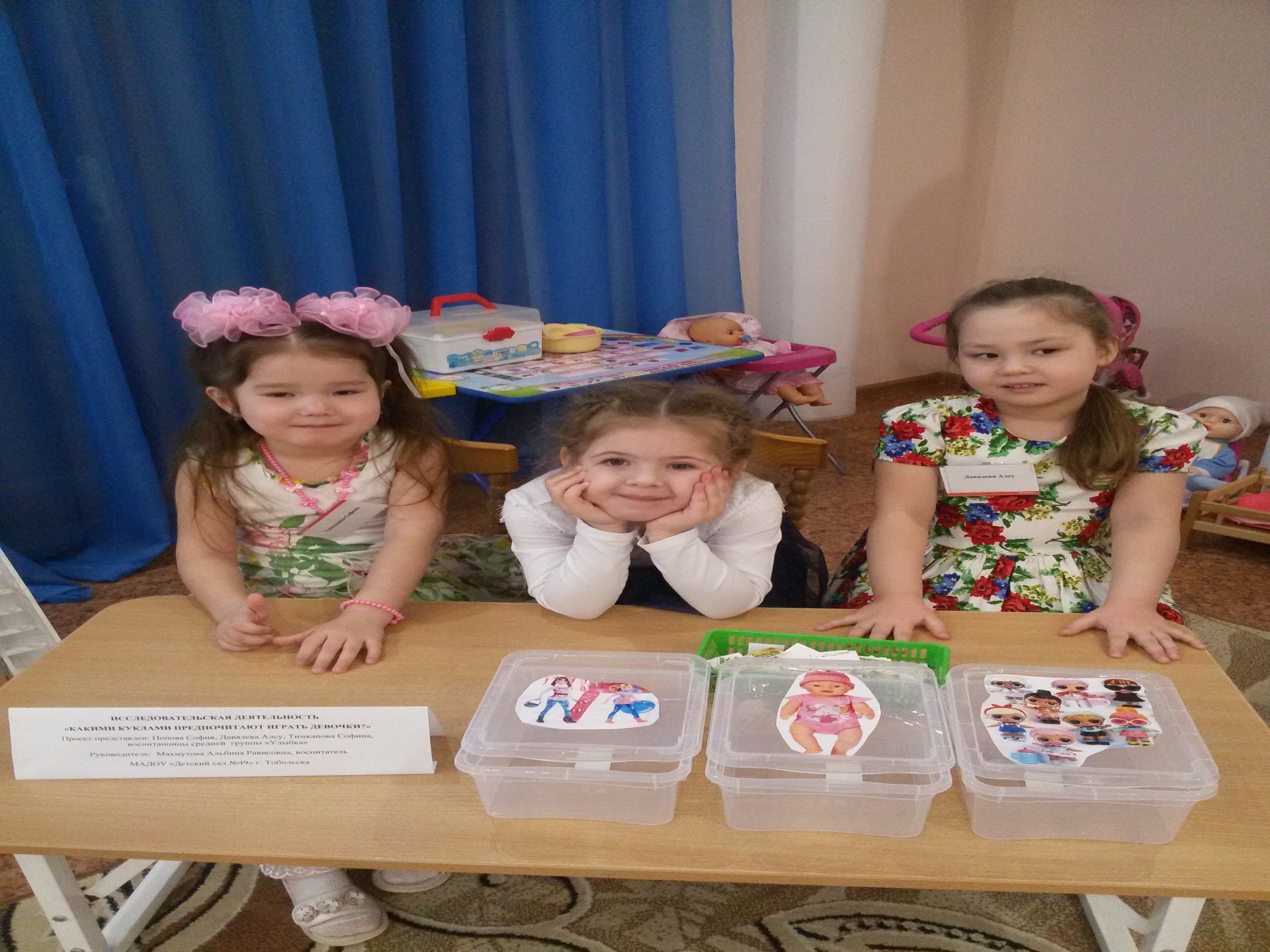 А вот девочки средней группы "Улыбка" Попова София, Тимканова Софина и Давалёва Алсу предложили поиграть девочкам в куклы, но не просто.... В ходе проекта они выяснили, какими куклами предпочитают играть девочки нашего детского сада?