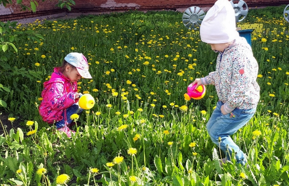 Вооружившись лейками, сачками и лупой, включив свое богатое воображение, ребята каждый день находят приключения и ответы на свои по-детски большие и важные вопросы. Сегодня мы нашли целую поляну одуванчиков и все смогли не только рассмотреть их строение (листья, стебель и бутон), но и ощутить аромат и мягкость лепестков.