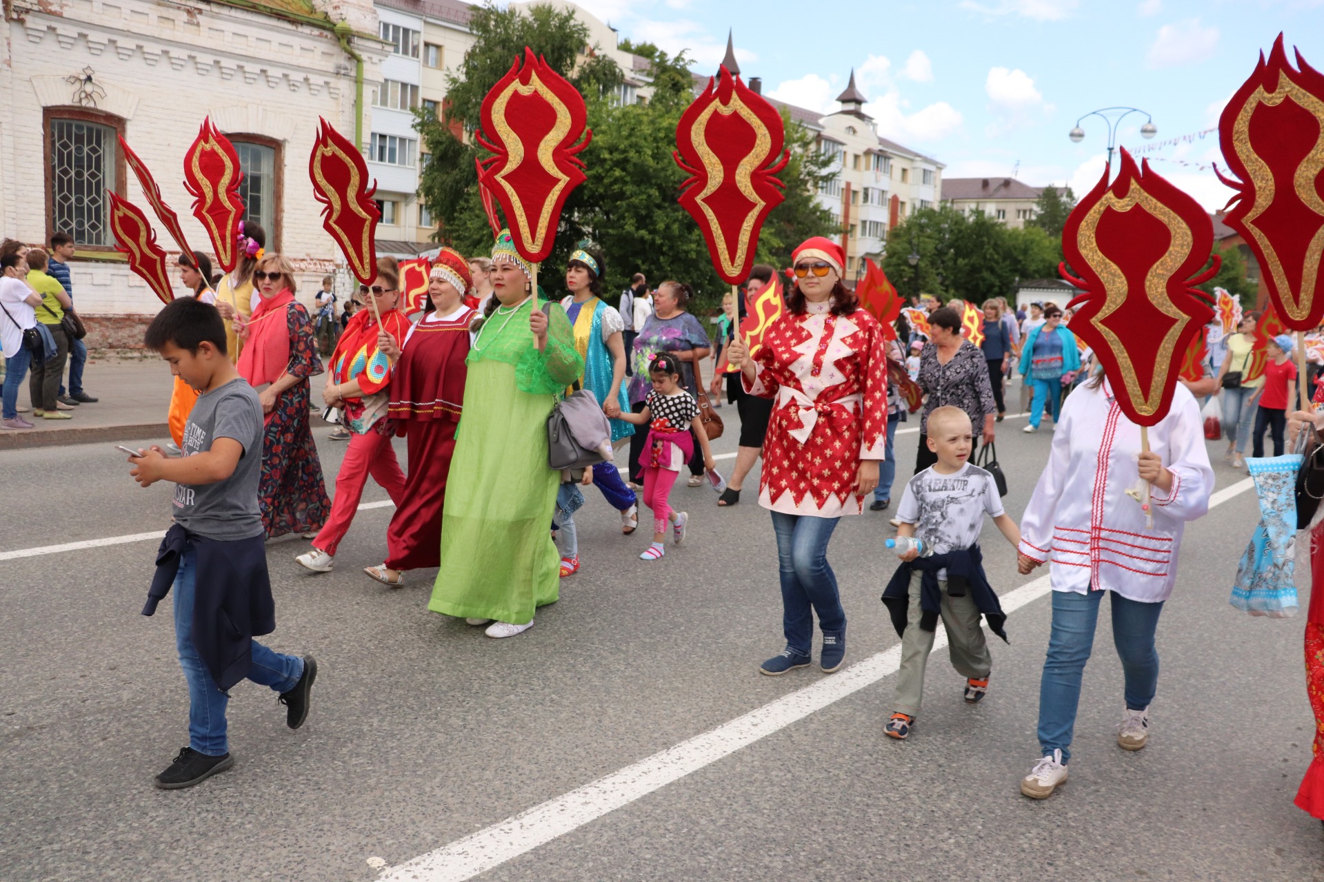 Колонна, которую представляли образовательные учреждения нашего города, олицетворяла образ жар птицы и жароптицевы перья.