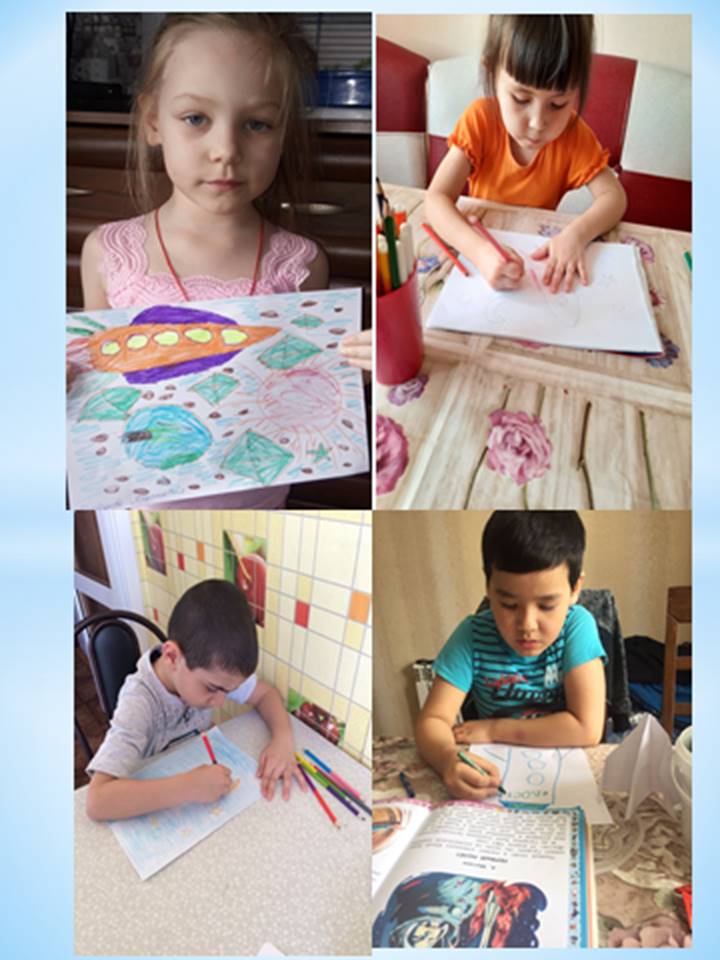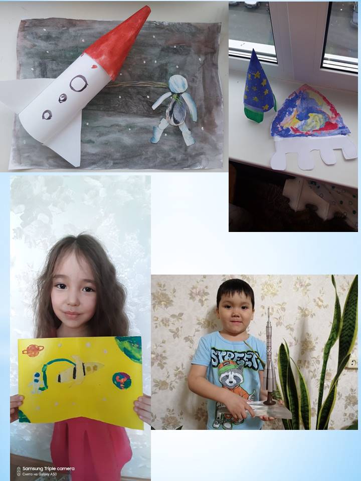 В условиях самоизоляции ребята вместе с родителями и воспитателями дружно и с энтузиазмом погрузились в мир космоса. Познакомились с названием планет, их расположением, а так же узнали факты биографии Юрия Гагарина, что впервые в космос полетела Белка и Стрелка. Свои впечатления дети отразили в своих работах.