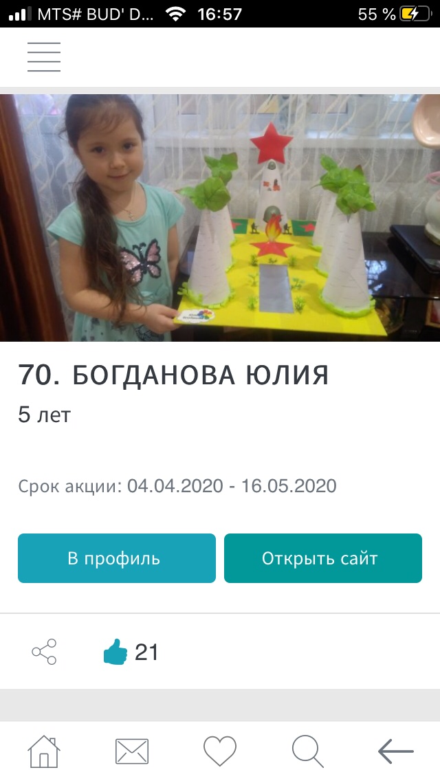 С этим вопросом родители средней группы «Почемучка» не остались один на один, так как педагог с удовольствием оказывает помощь родителям в режиме online. Так, например в мессенджер-приложении Viber при помощи аудиозвонков родители и воспитанники всегда на связи с педагогом, в при необходимости решения каких-либо общих вопросов родители всегда могут связаться с педагогом через конференц-связь. В мобильном приложении «Любимый город» родители с детьми имеют возможность ознакомиться с городскими конкурсами. Так Юленька вместе с мамой подготовили поделку, и приняла участие в конкурсе творческих работ для детей и подростков «Великой Победе посвящается».