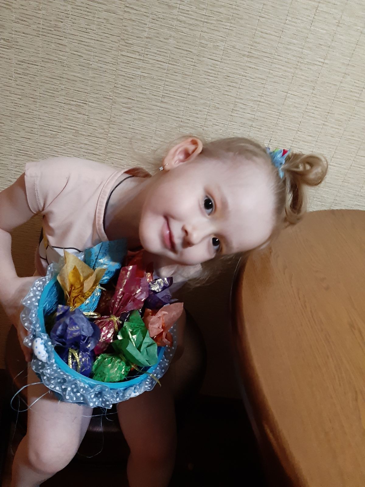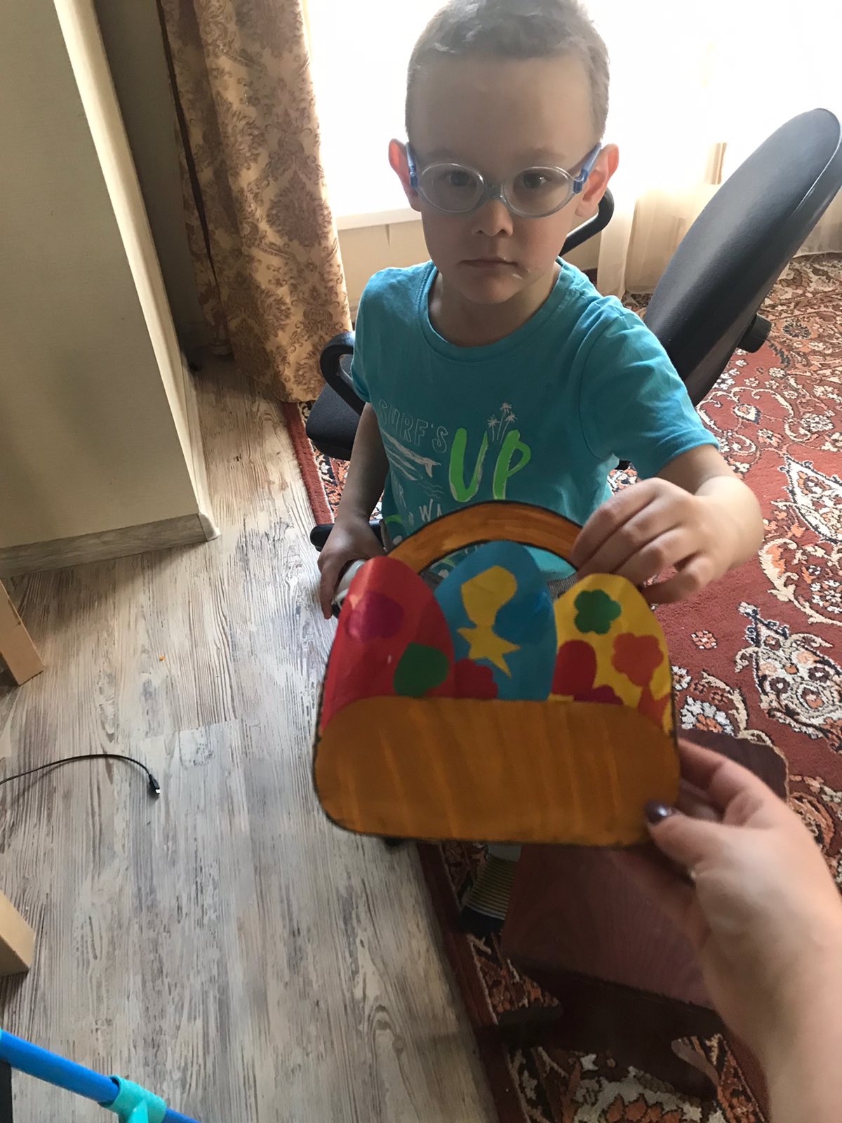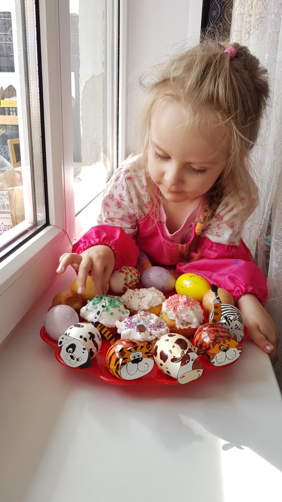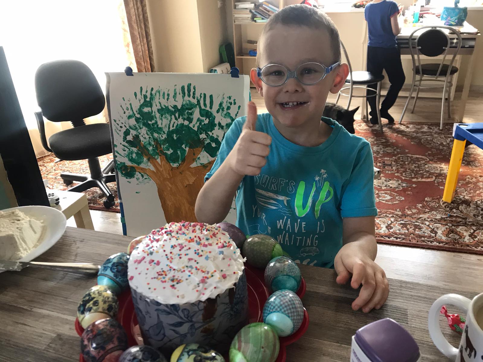 Лада придумала свой способ украшения, заворачивая яички в яркую фольгу в форме - конфетки. А Глеб, Алана и Ромашка принимали участие не только в приготовление, они сделали творческие работы.
