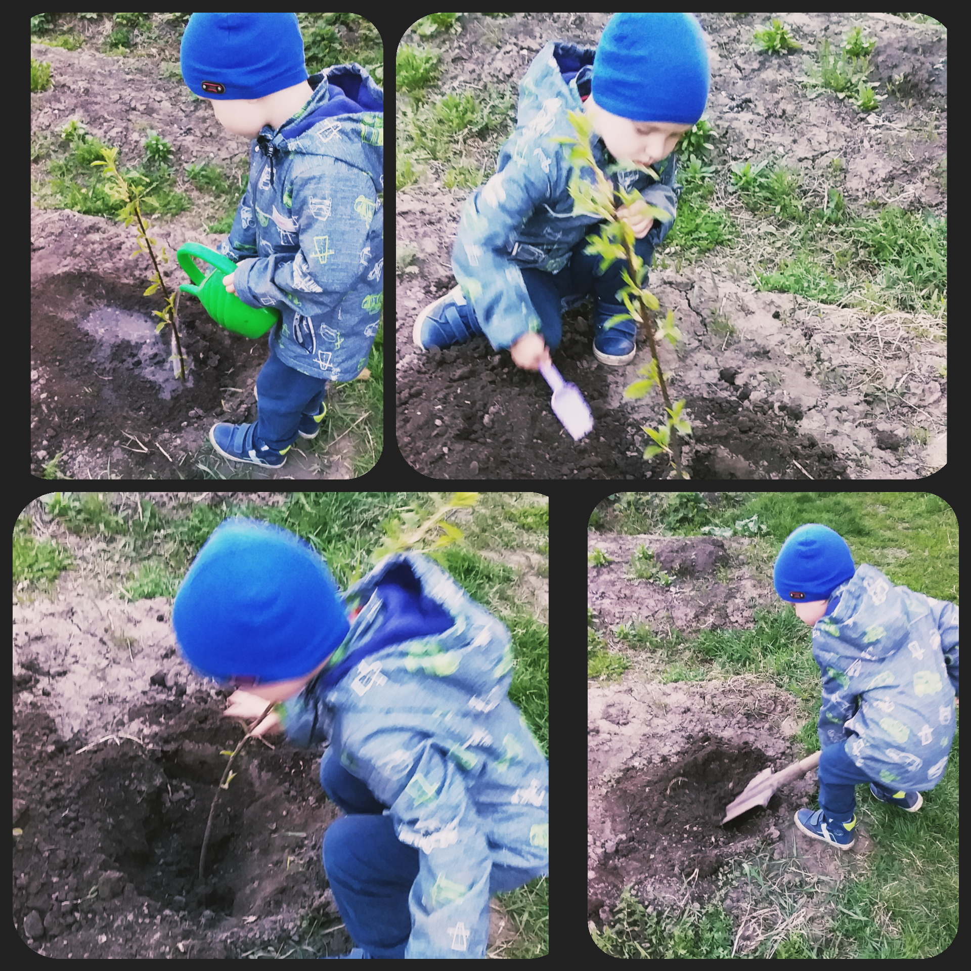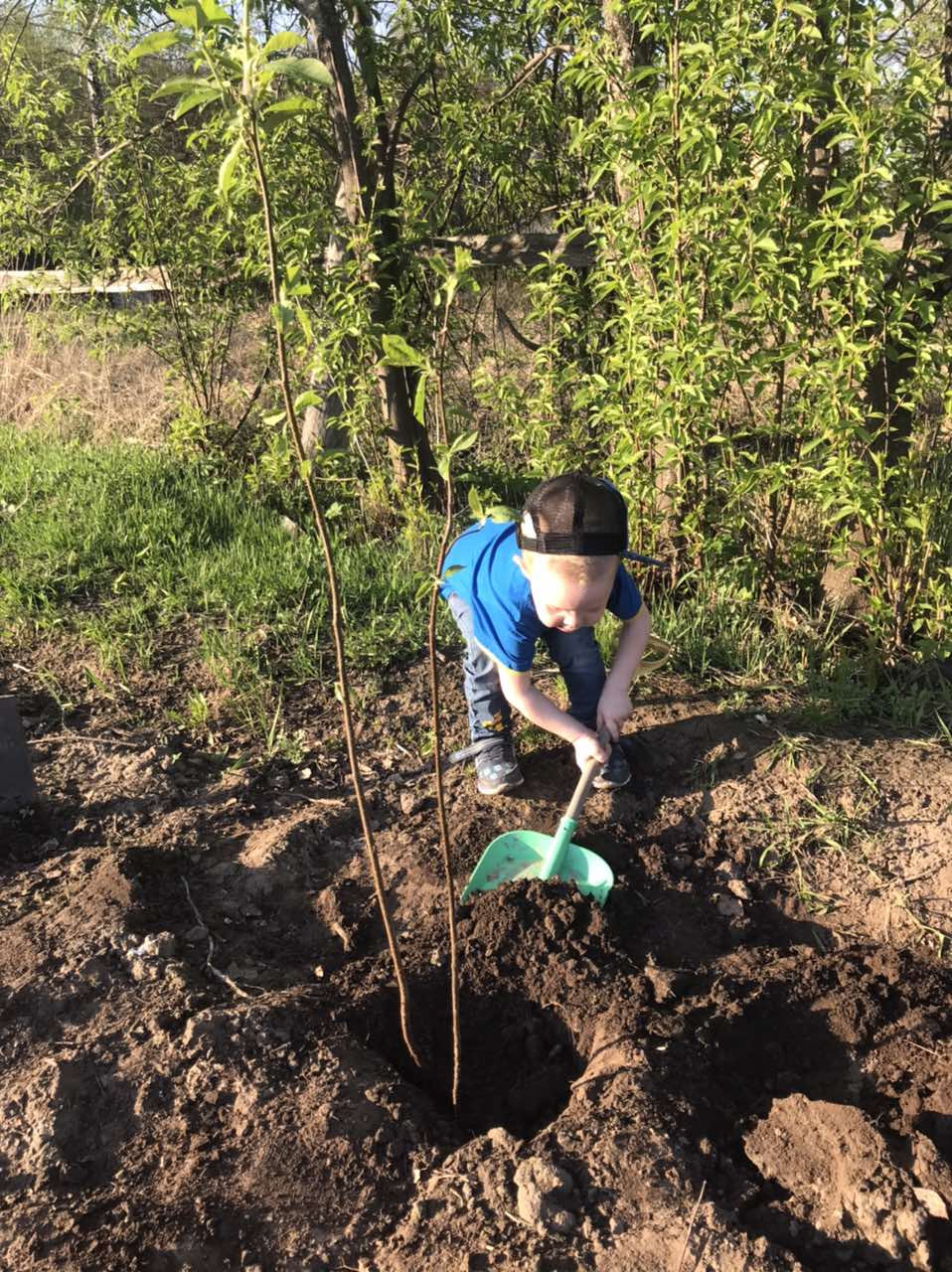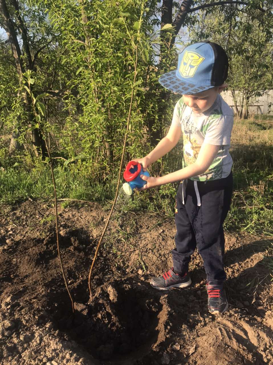 Ребята высаживают деревья в честь героя, отдавшего жизнь за родину у себя на даче, во дворе дома, там где они могут сделать это изолированно .