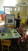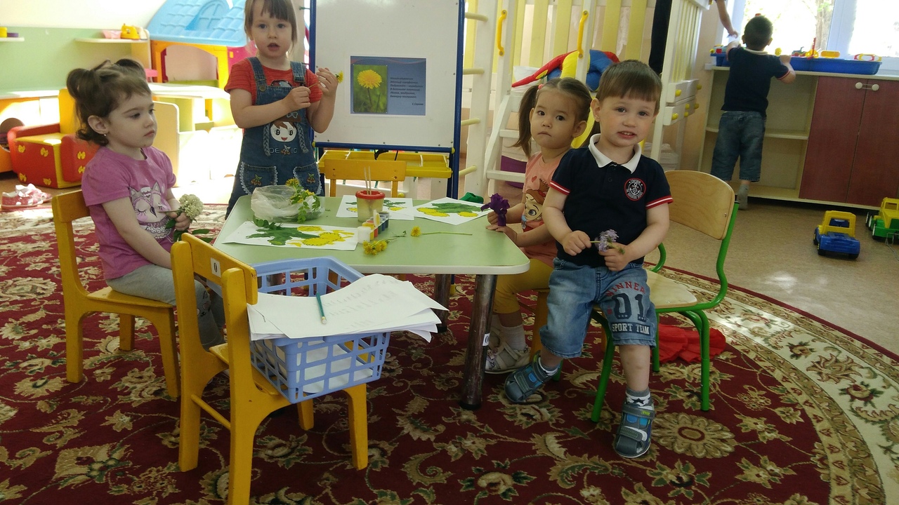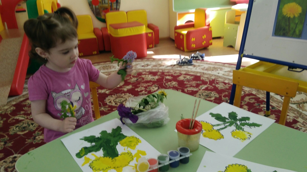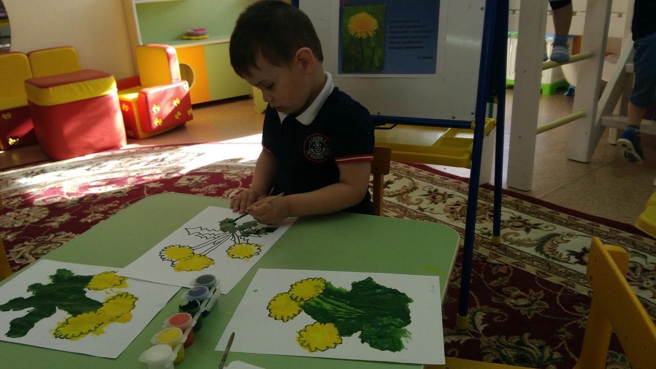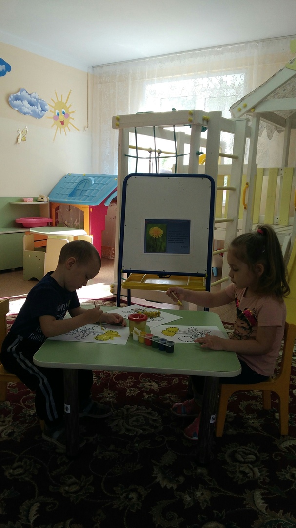 Предоставили детям возможность договаривать слова и фразы при чтении воспитателем знакомого стихотворения «Одуванчик». Закрепляли умения детей закрашивать одуванчик с помощью кисточки и краски.