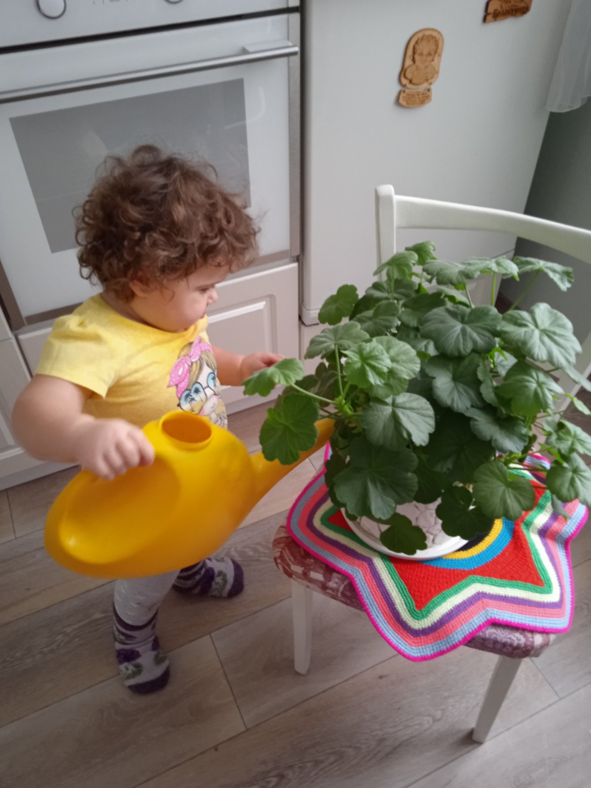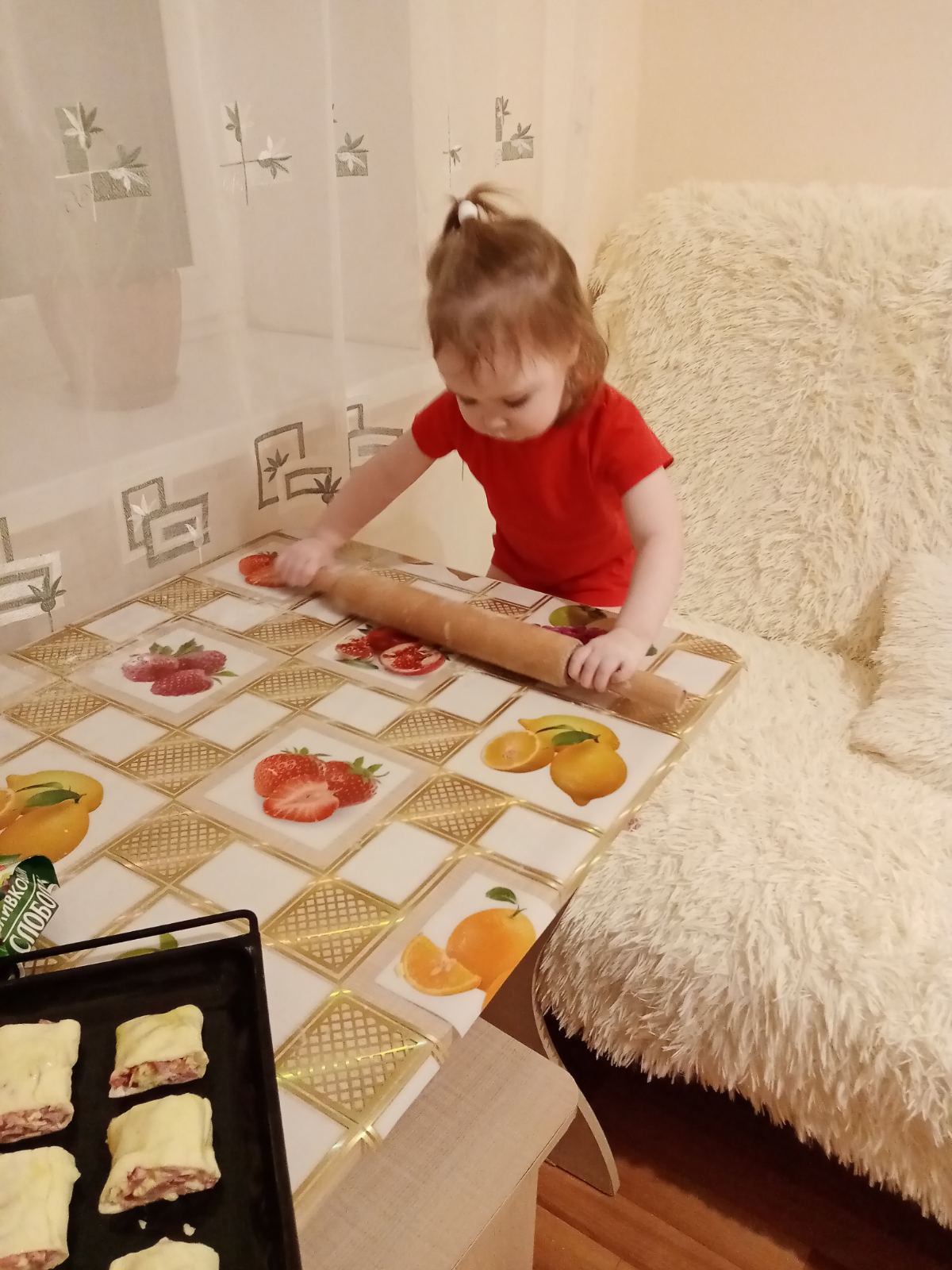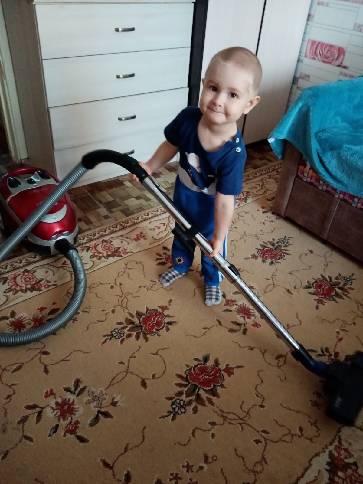 Илюша помогает маме пылесосить. Ксюша помогает печь пирожки.