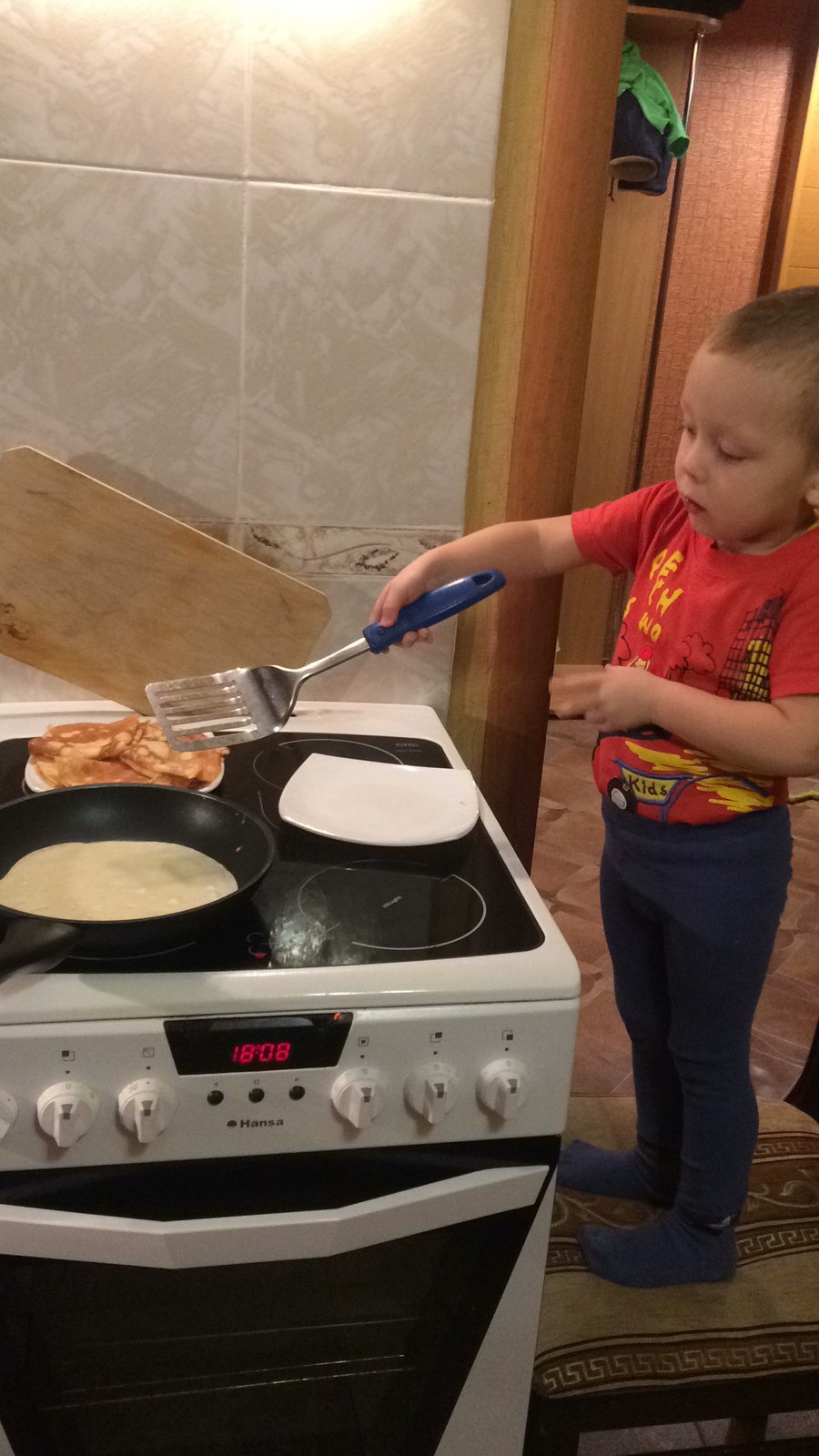 Елисей помогает бабушке печь блины. Ксюша поливает цветы.