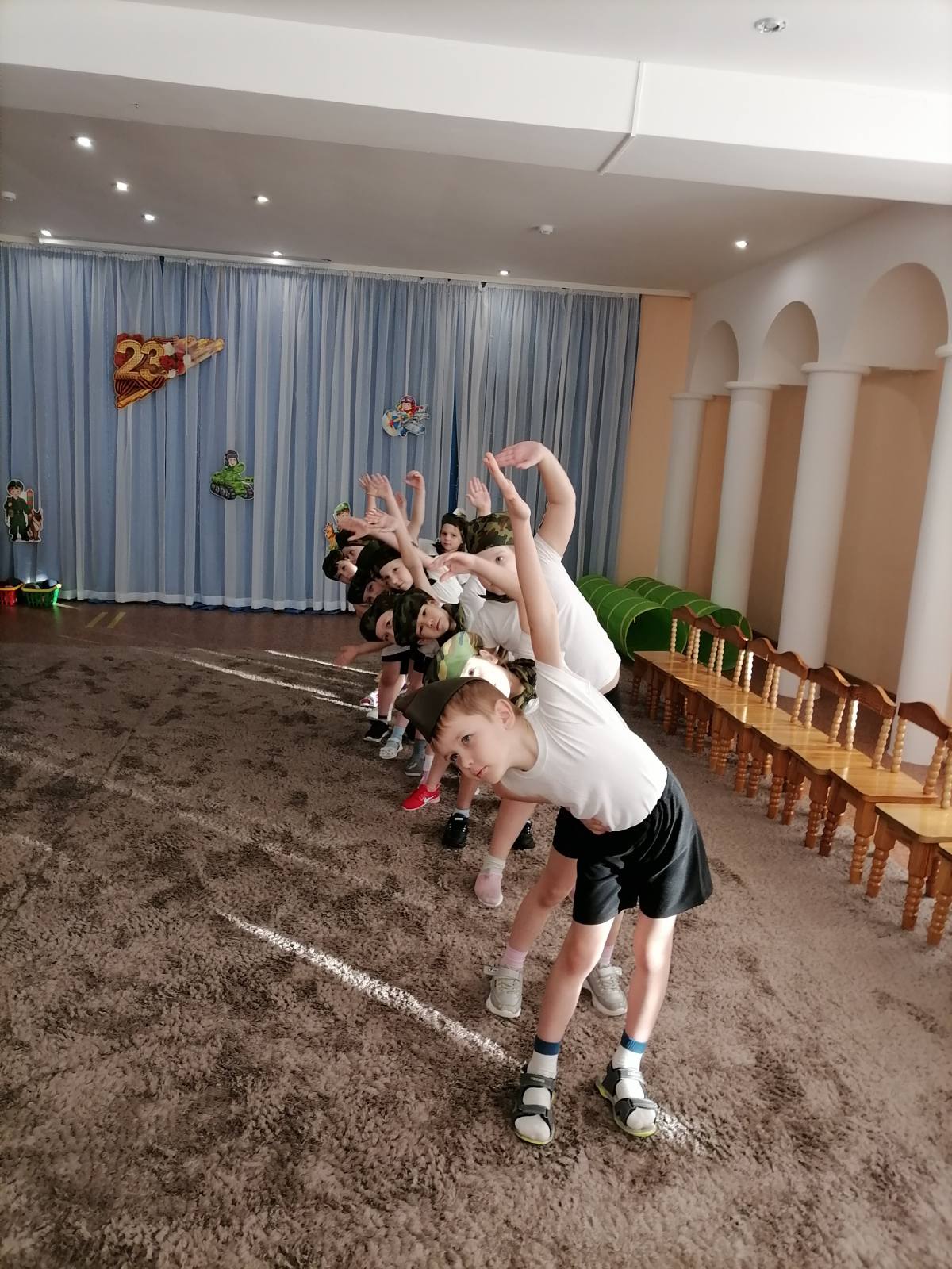 Для выполнения важного задания, как и положено будущим разведчикам, дети провели разминку. В ходе развлечения, дети каждой группы, получив задание, перемещались по залу по заранее намеченному маршруту, отмеченному на карте, по станциям.
