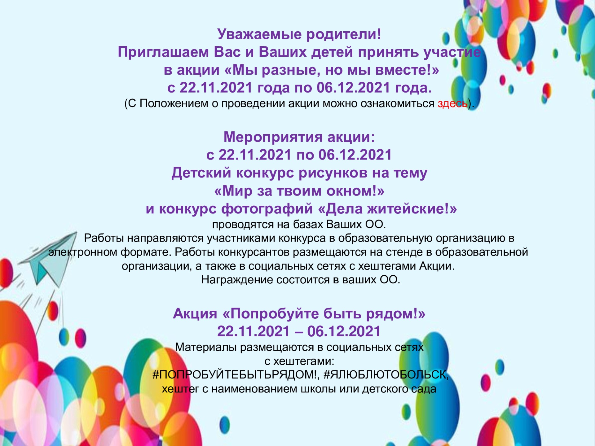 Приглашаем Вас и Ваших детей принять участие в акции «Мы разные, но мы вместе!» с 22.11.2021 года по 06.12.2021 года.