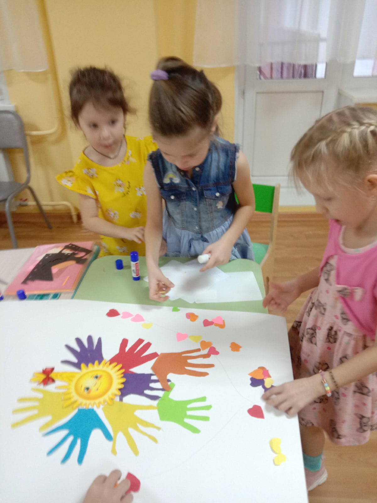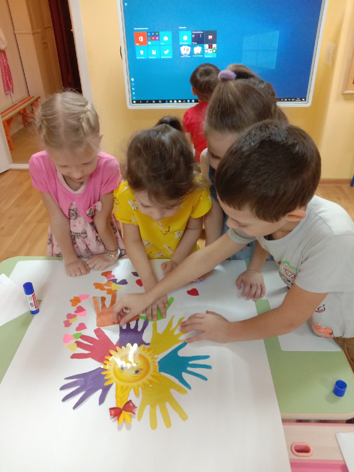 Что можно сделать, чтобы поддержать товарища, как можно помочь своим родителям. Сделали коллективную аппликацию "Хоровод доброты" из разноцветных ладошек
