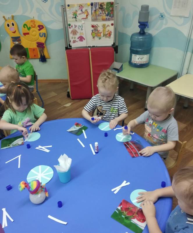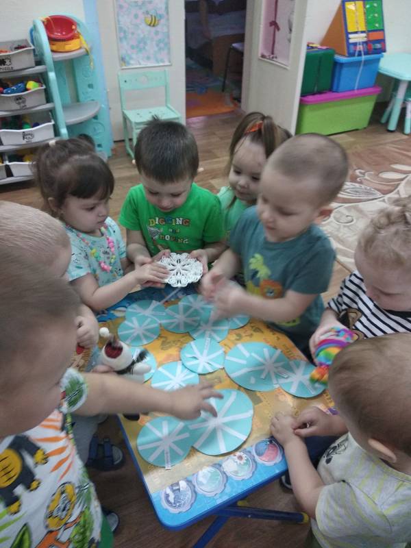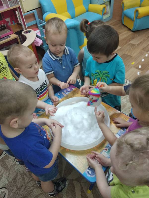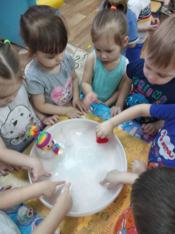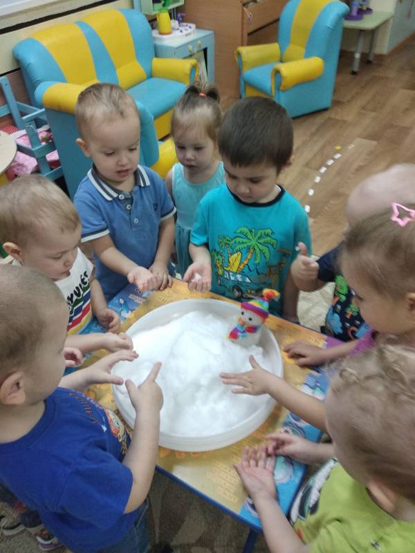Познакомиться со свойствами снега, сезонными изменениями в природе детям группы «Цыплята» помогла зимушка-зима и снеговик. Они пришли в гости и принесли в большой чаше много снега. В процессе экспериментально - исследовательской деятельности потрогали снег, узнали, что он холодный, белый. Если положить на ладонь - растает. Совместно с педагогами дети выяснили, что снег тает, превращается в воду. А также слепили снеговика из снега и, чтобы он не растаял, дети сделали снежинки, из которых в последствии сложили сугроб.