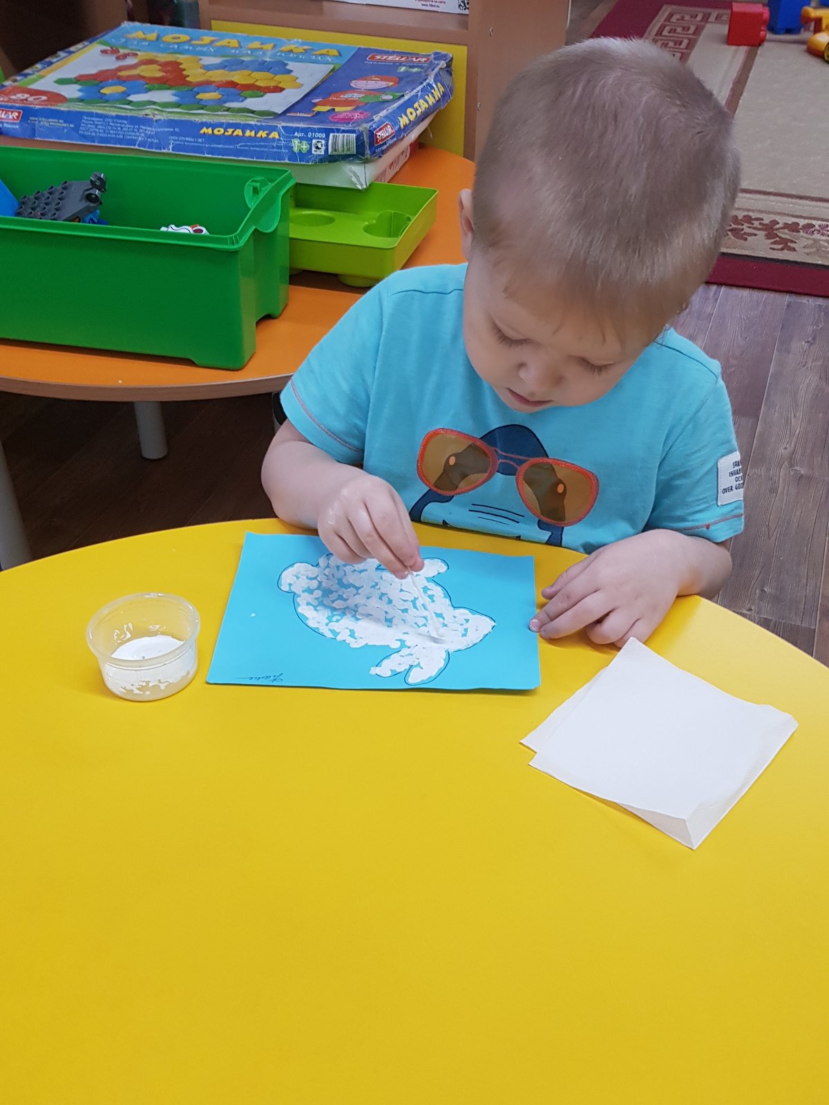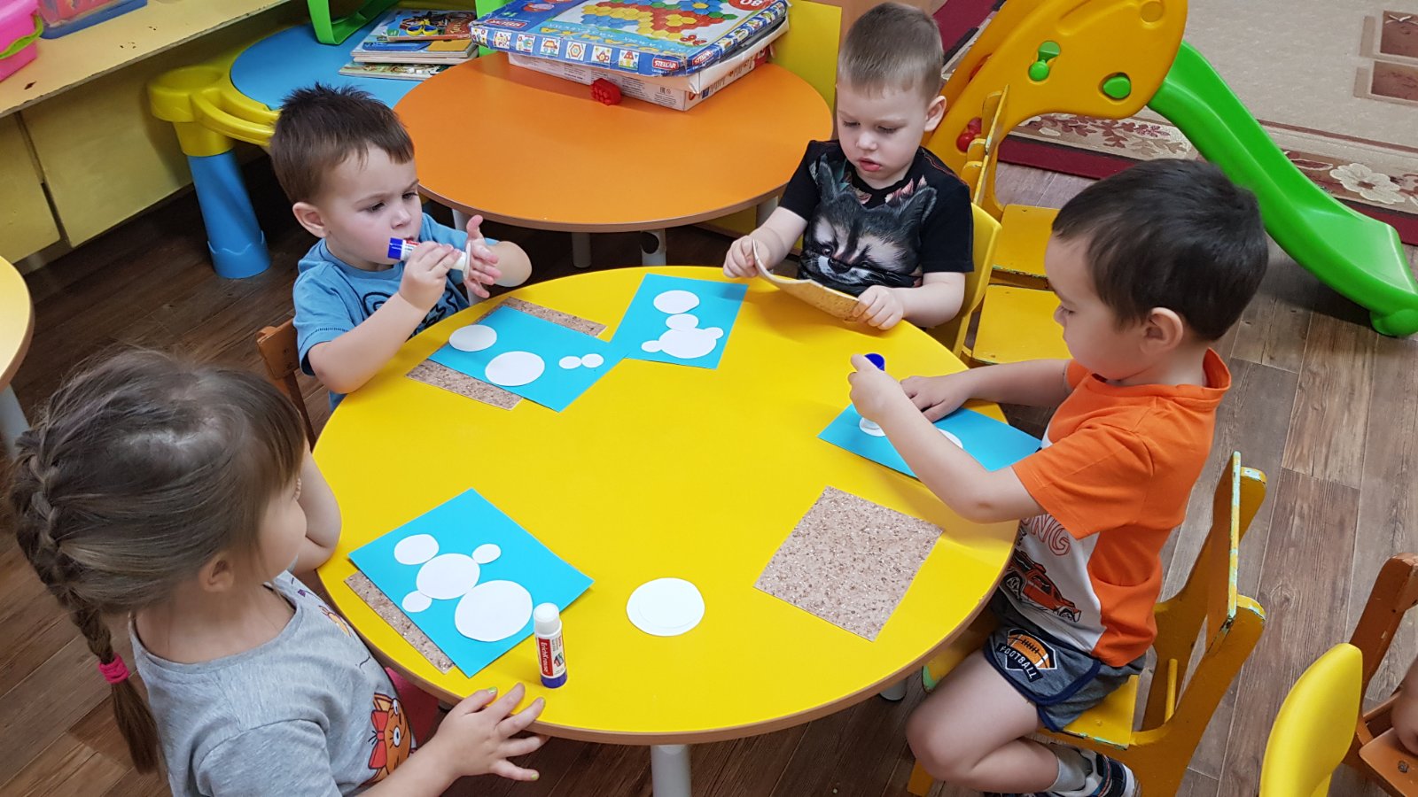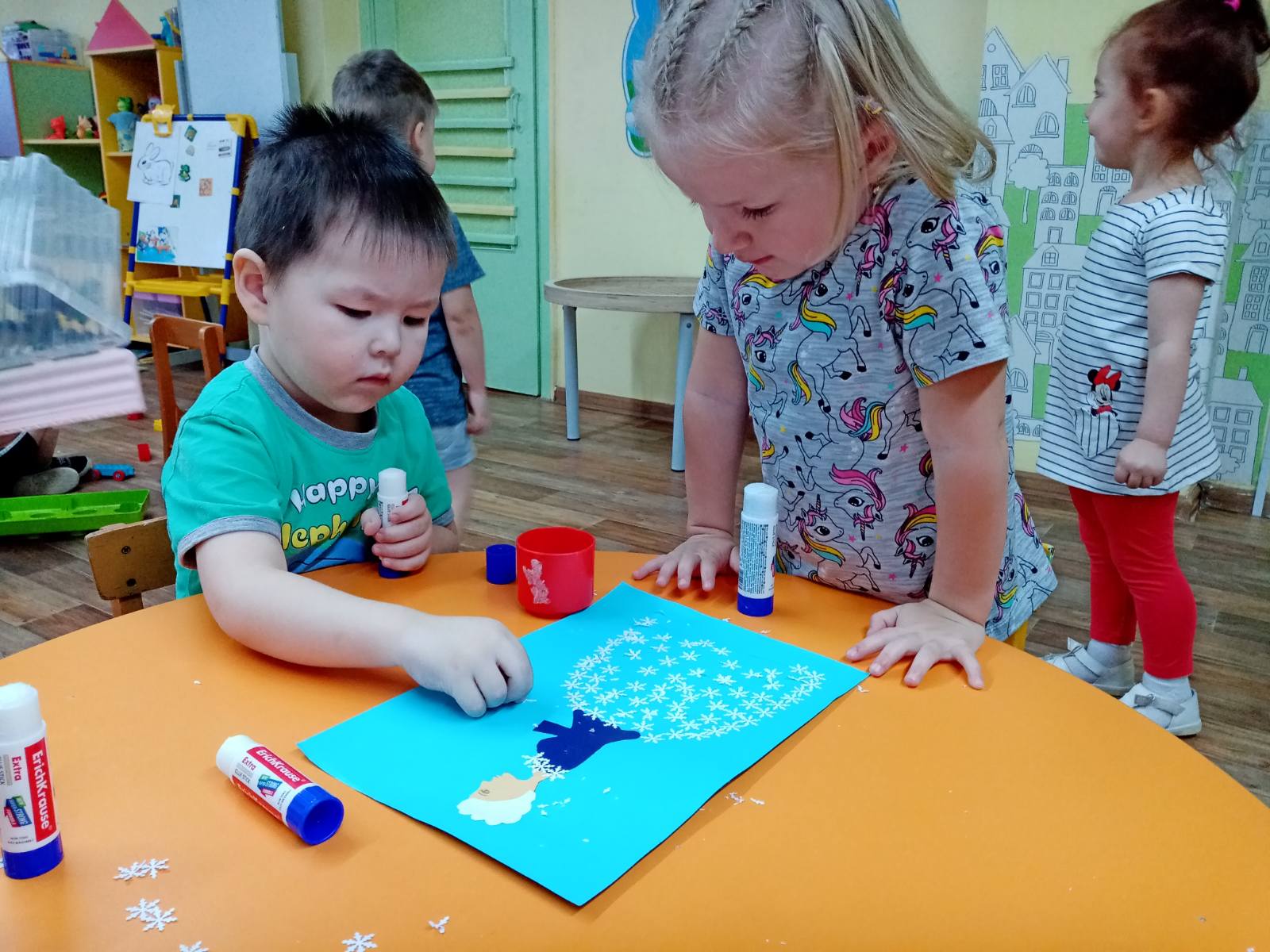 Совместно с малышами готовим открытки к Новому году, где закрепляем цвет, форму, упражняемся в технике наклеивания.