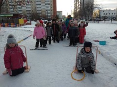 Разделившись на две команды, соревновались в скорости-«Кто быстрей», «Не потеряй друга», ловкости-«Пронеси, не урони», «Пролезь под дугу», «На одной ножке» и смекалке «Доскажи словечко».