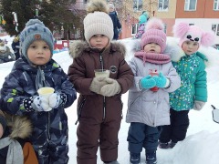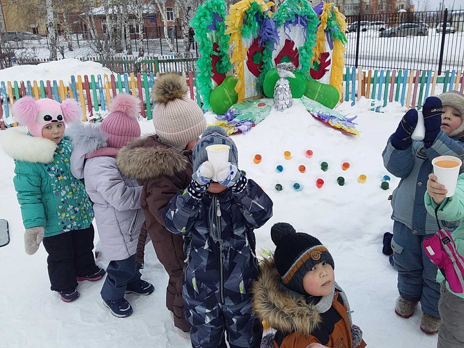 Сегодня они достали свои стаканчики, вынули льдинки и украсили ими снежные постройки на участке. Особенно красивым оказалось украшенное льдинками платье Жар - птицы.