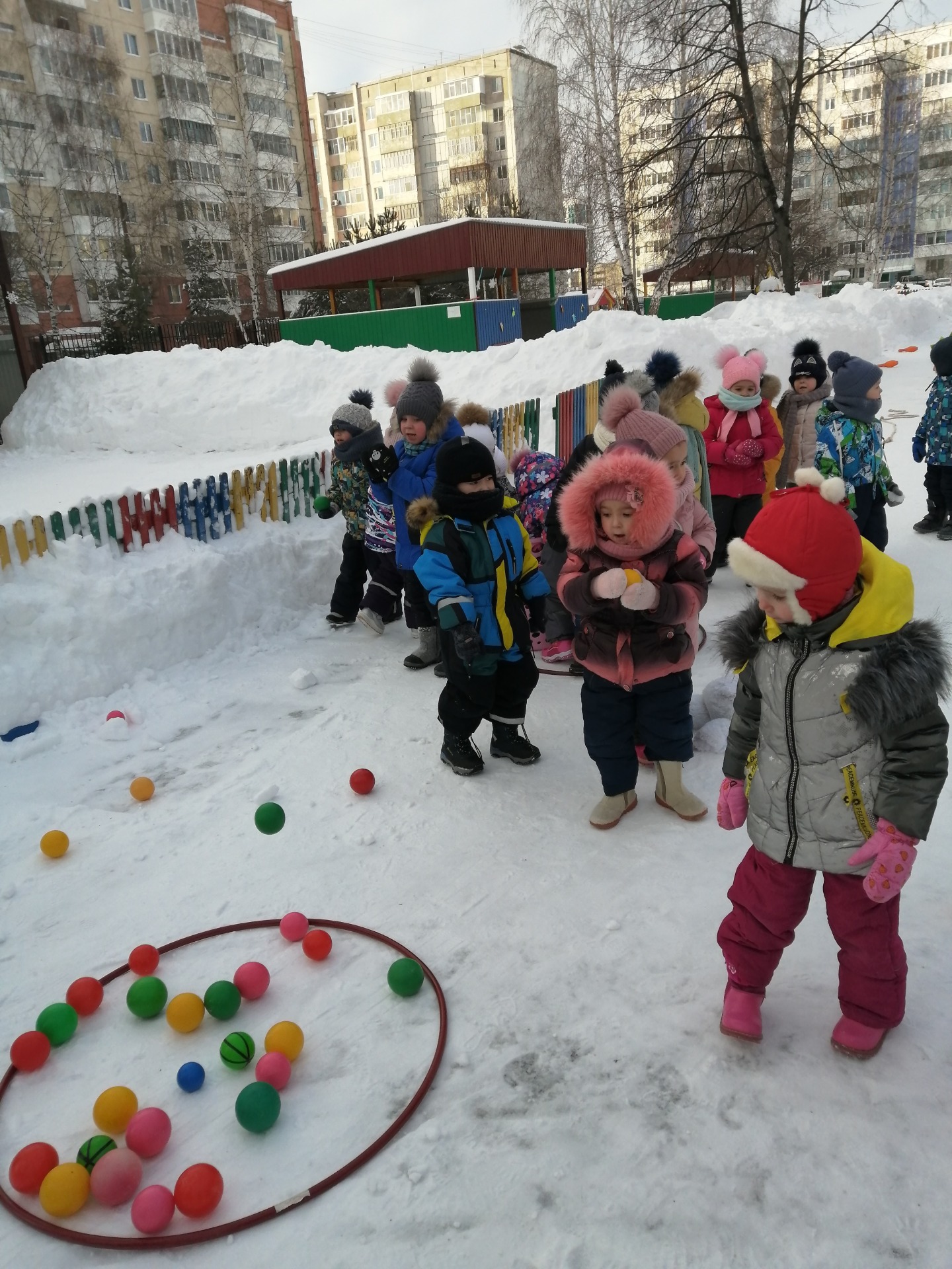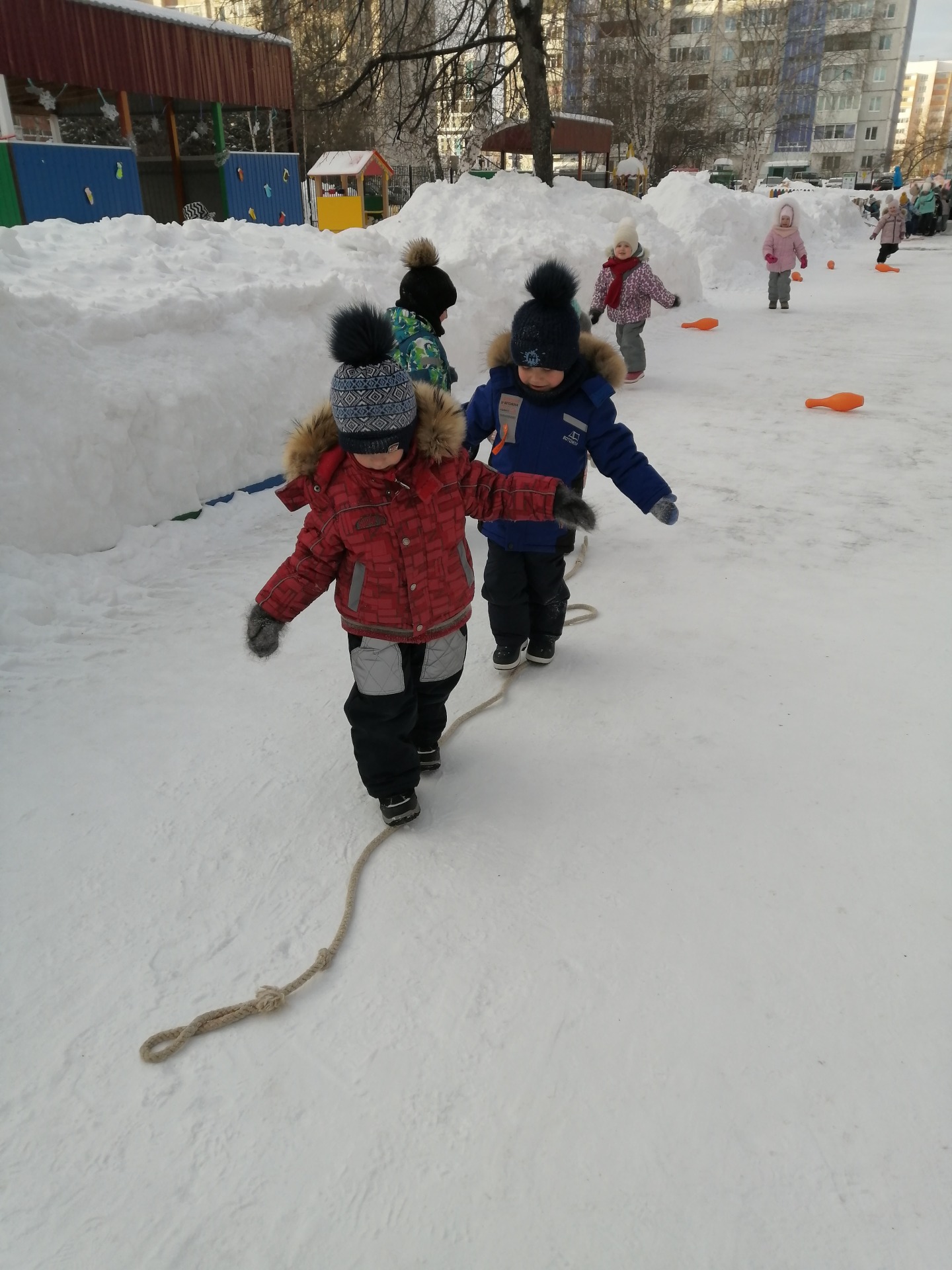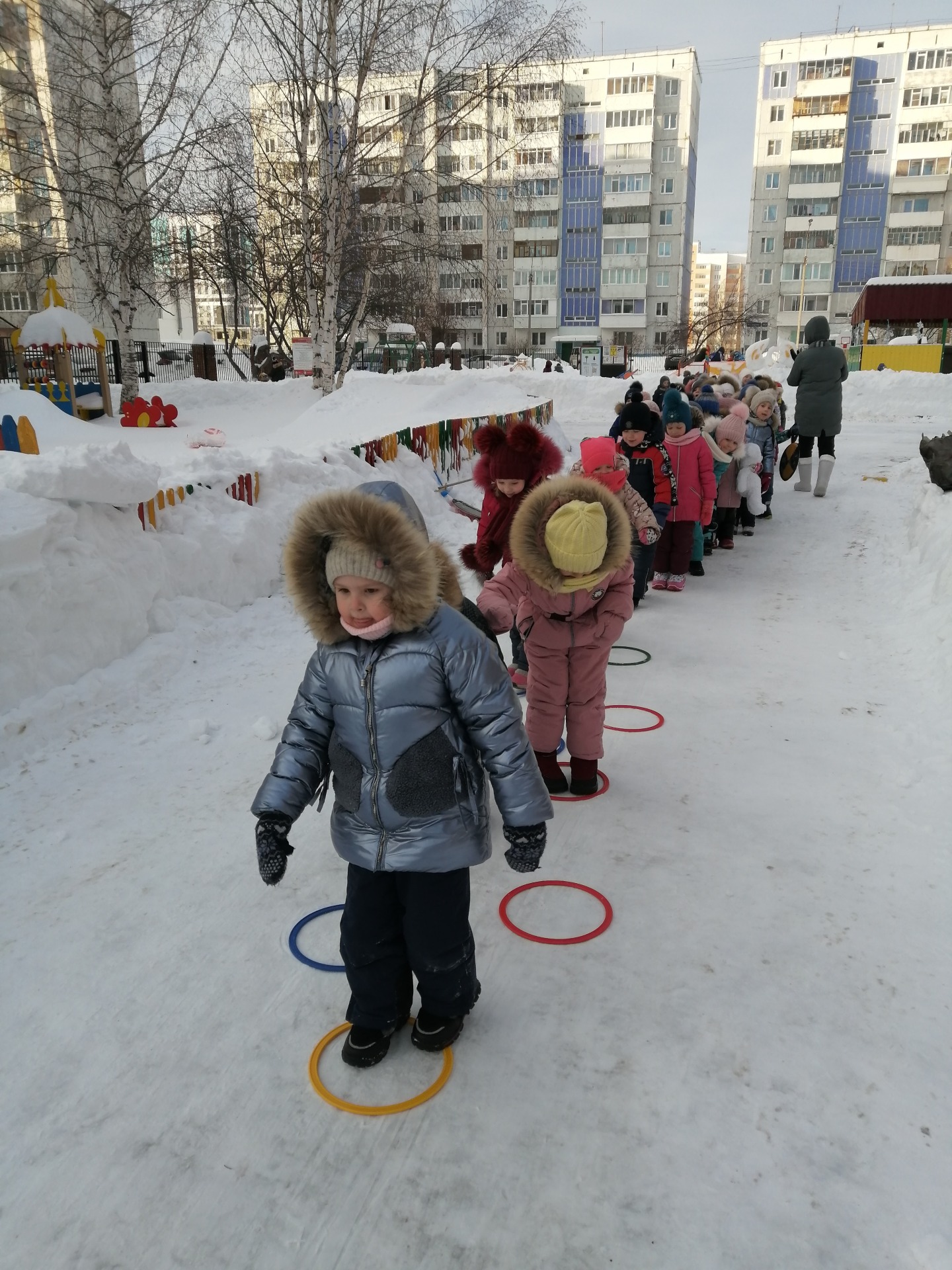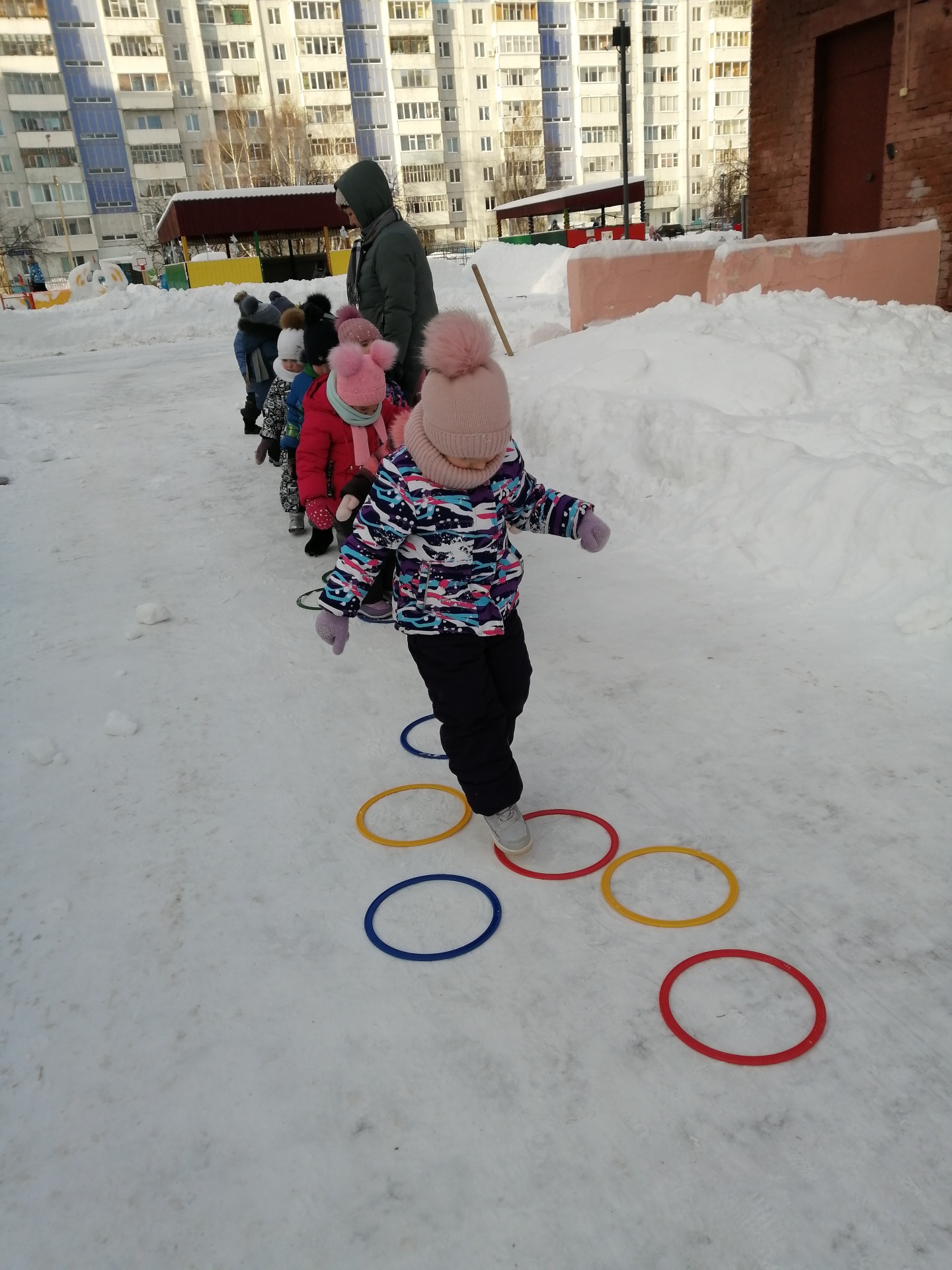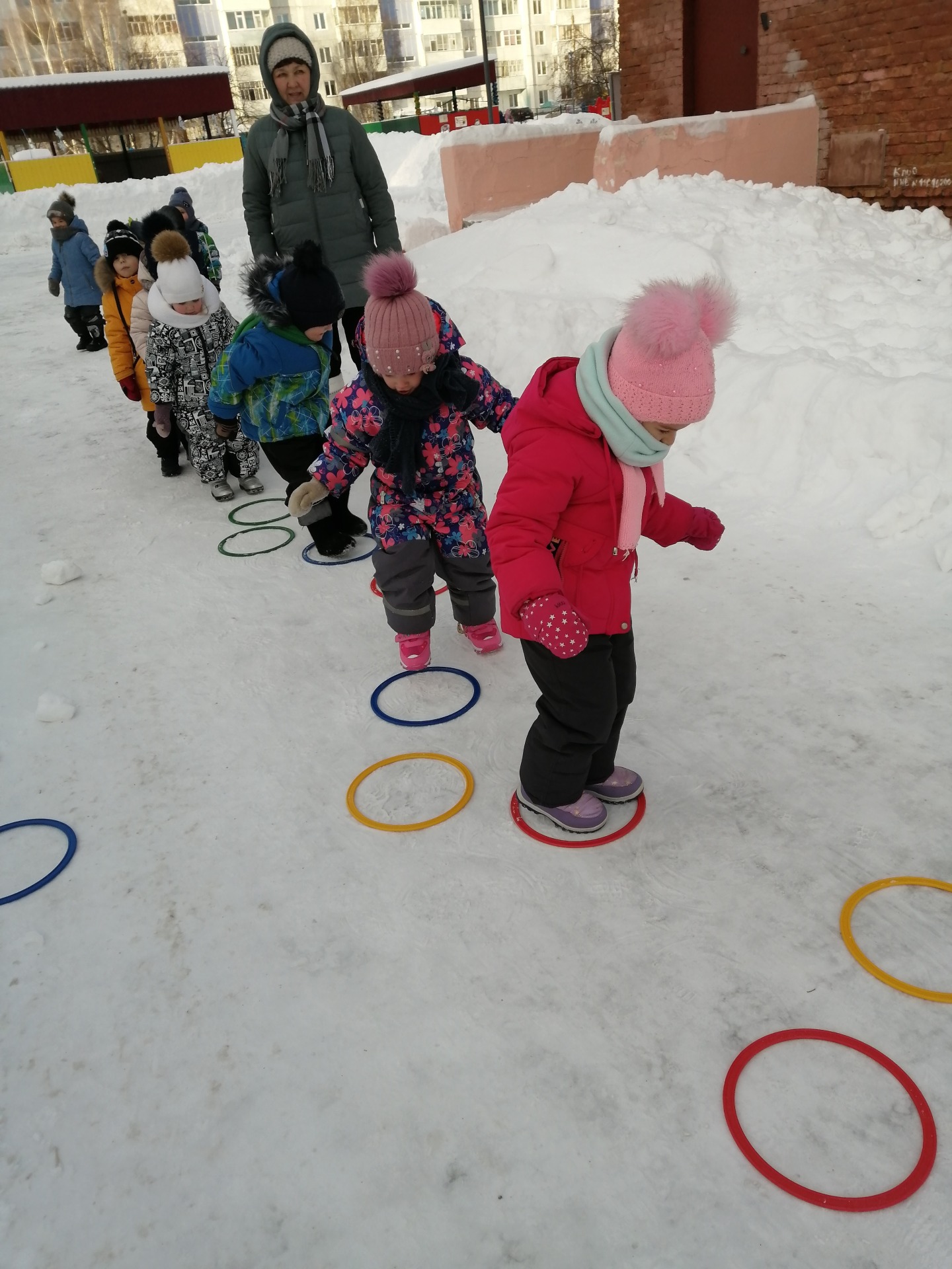 Первым заданием нужно было прыгать из обруча в обруч, затем пробежать между кеглями, пройти приставным шагом по канату, попасть мячом в цель и заключительным было задание, прыжки с продвижением вперёд.