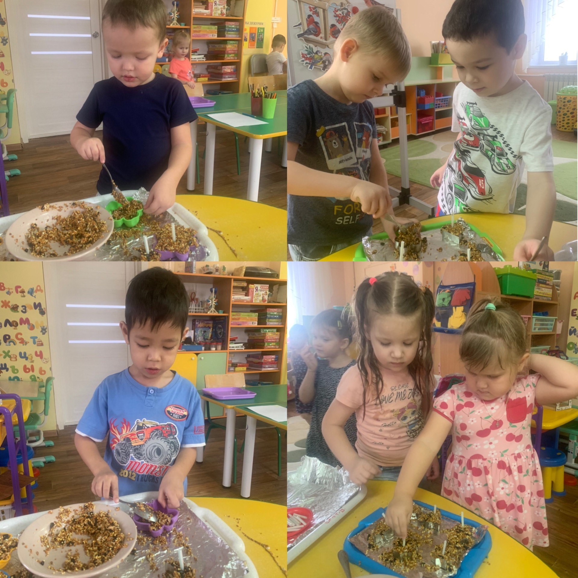 Зима – это настоящее испытание для наших пернатых друзей. Мы с ребятами группы «Речецветик» решили помочь птицам и сделать для них эко кормушки из зерен и семян. Мы дружно взялись за дело. В подготовленный желатин засыпали корм, когда получилась густая масса, наполнили формочки смесью.