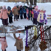 Для того, чтобы получились отверствия для лент, вставили нарезанные на кусочки коктейльные трубочки. После того как кормушки застыли, достали их из формы, привязали к ним ленточки и можно угощать наших пернатых друзей. Вот и готовы наши вкусные угощения для пернатых друзей. А на прогулке все гостинцы были развешаны на деревьях. Сколько радости было у детей, когда они увидели, как птицы с громким щебетанием облепили угощения, приготовленное своими руками.