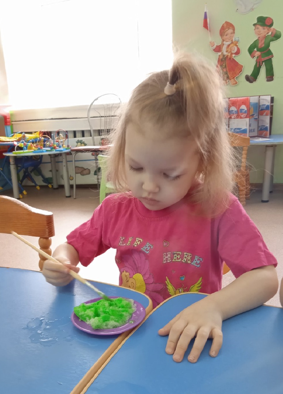 Затем дети окрашивали снег в разные цвета. Ребята остались довольны таким экспериментом.