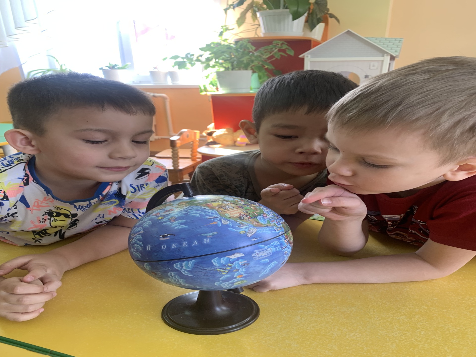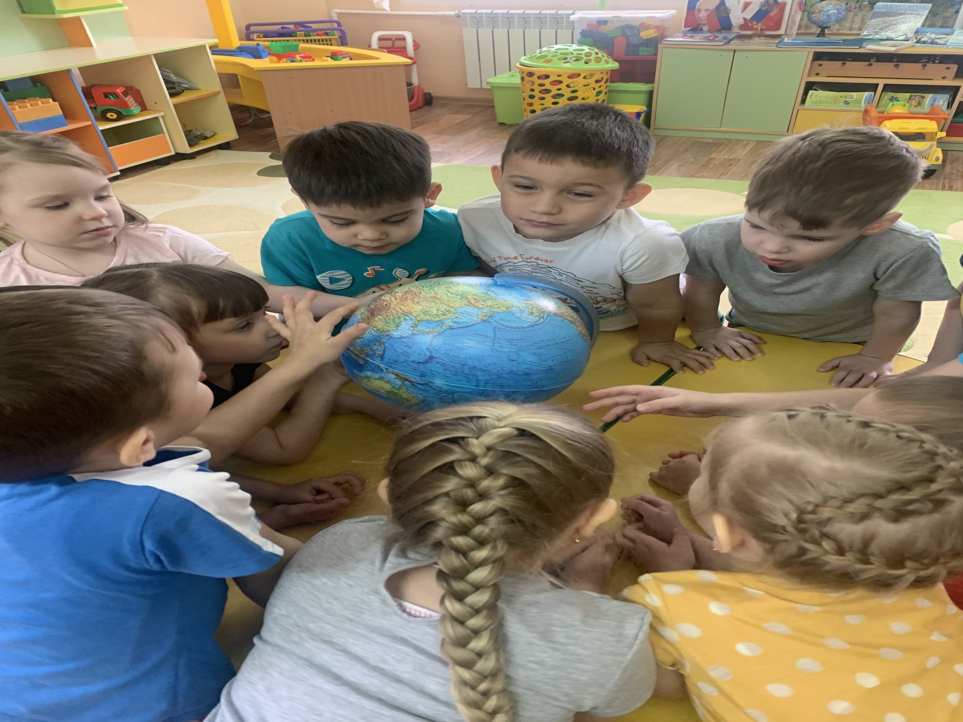 Дети познакомились с глобусом. Поворачивая глобус, решили, что он такой же круглый, как наша земля, сосчитали количество материков и даже нашли место, где мы живём, отметили, что самая большая страна — это Россия.