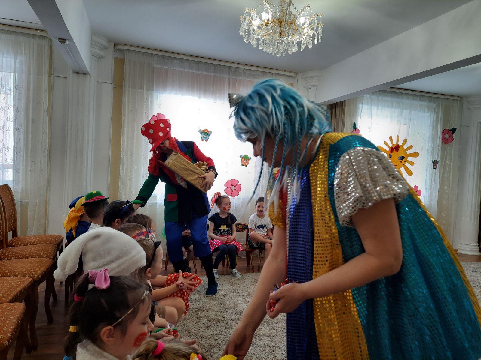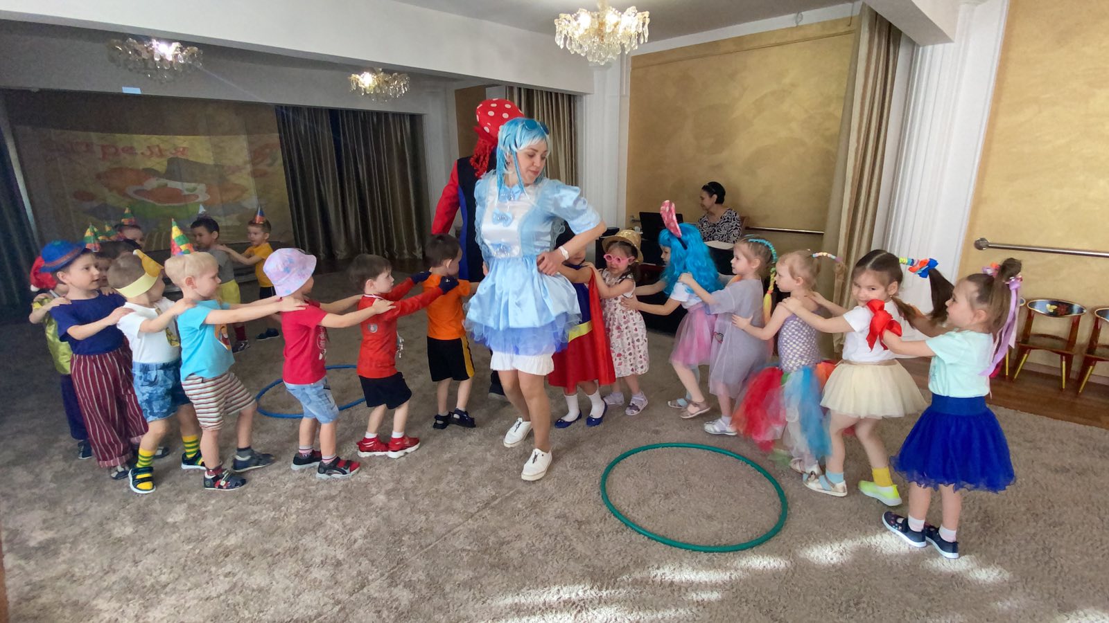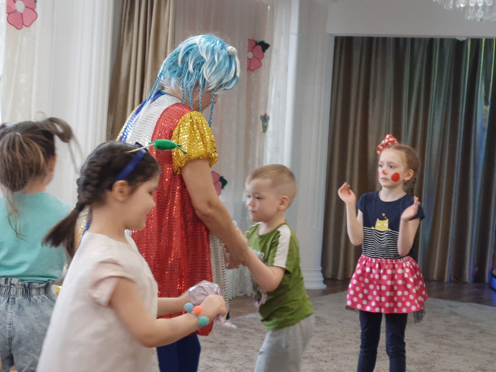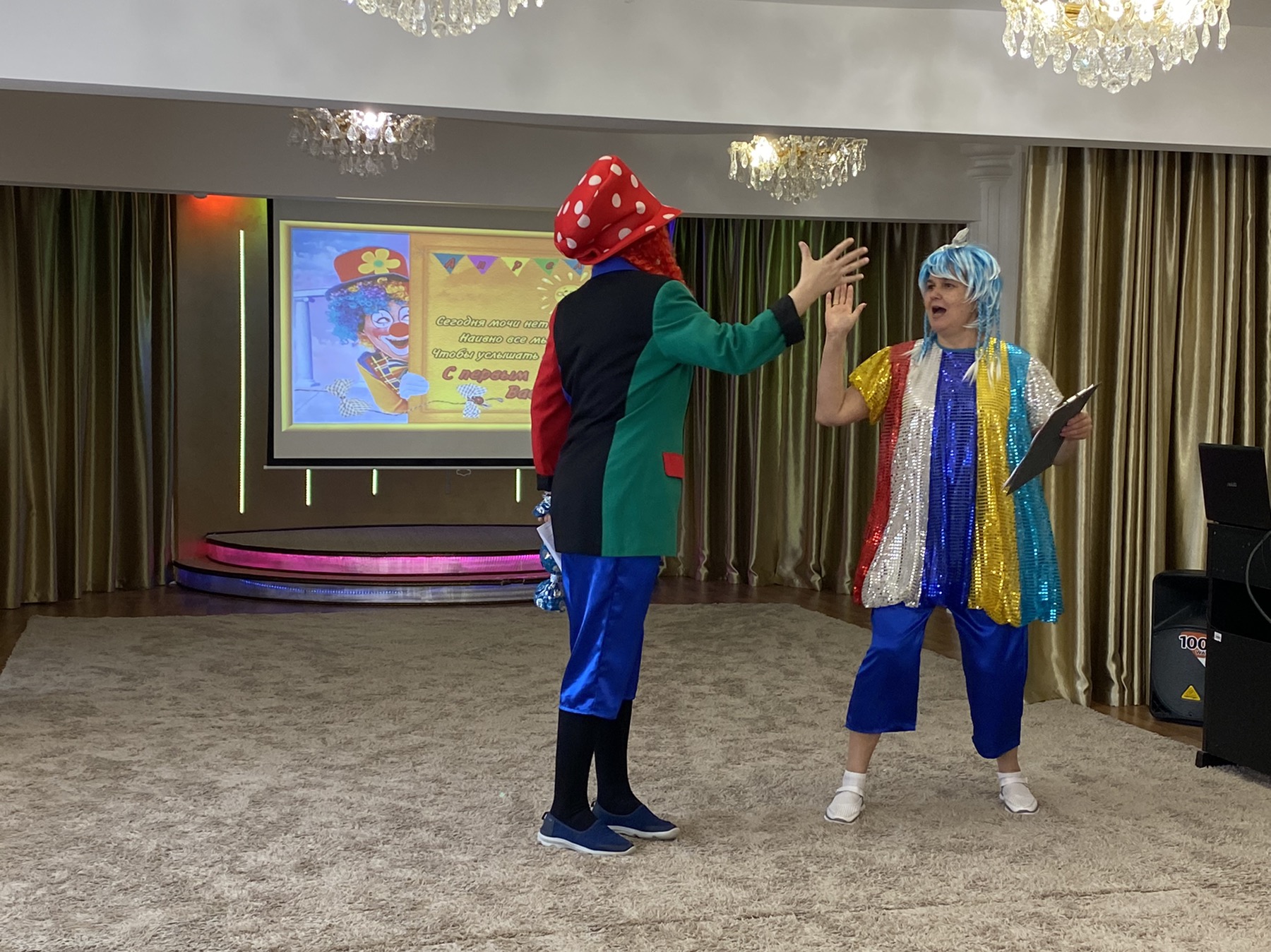 В музыкальном зале детей встречали клоуны Тепа и Веселинка, которые вместе с детьми пели, танцевали и играли. Все первоапрельские шутки, розыгрыши, конкурсы стали в этот день для детей полным сюрпризом. На протяжении всего праздника ребят не покидало веселое, бодрое, позитивное настроение.
