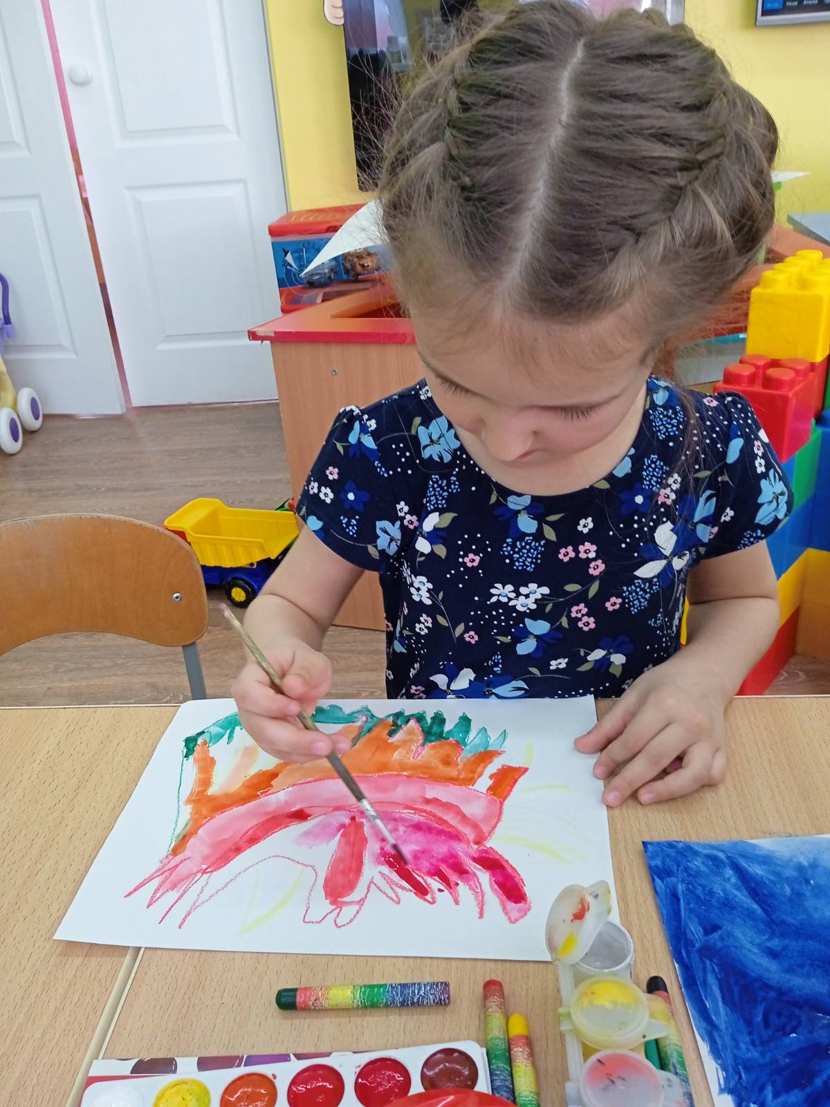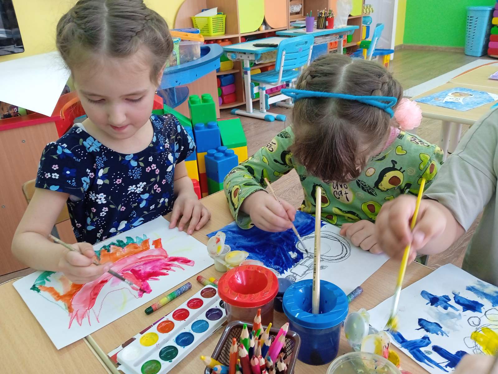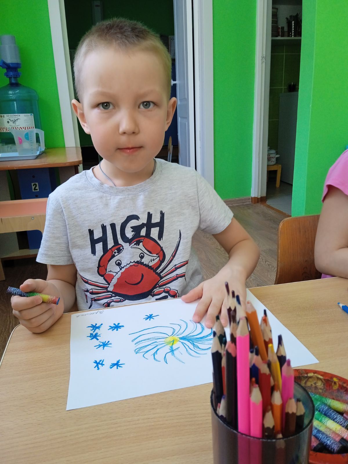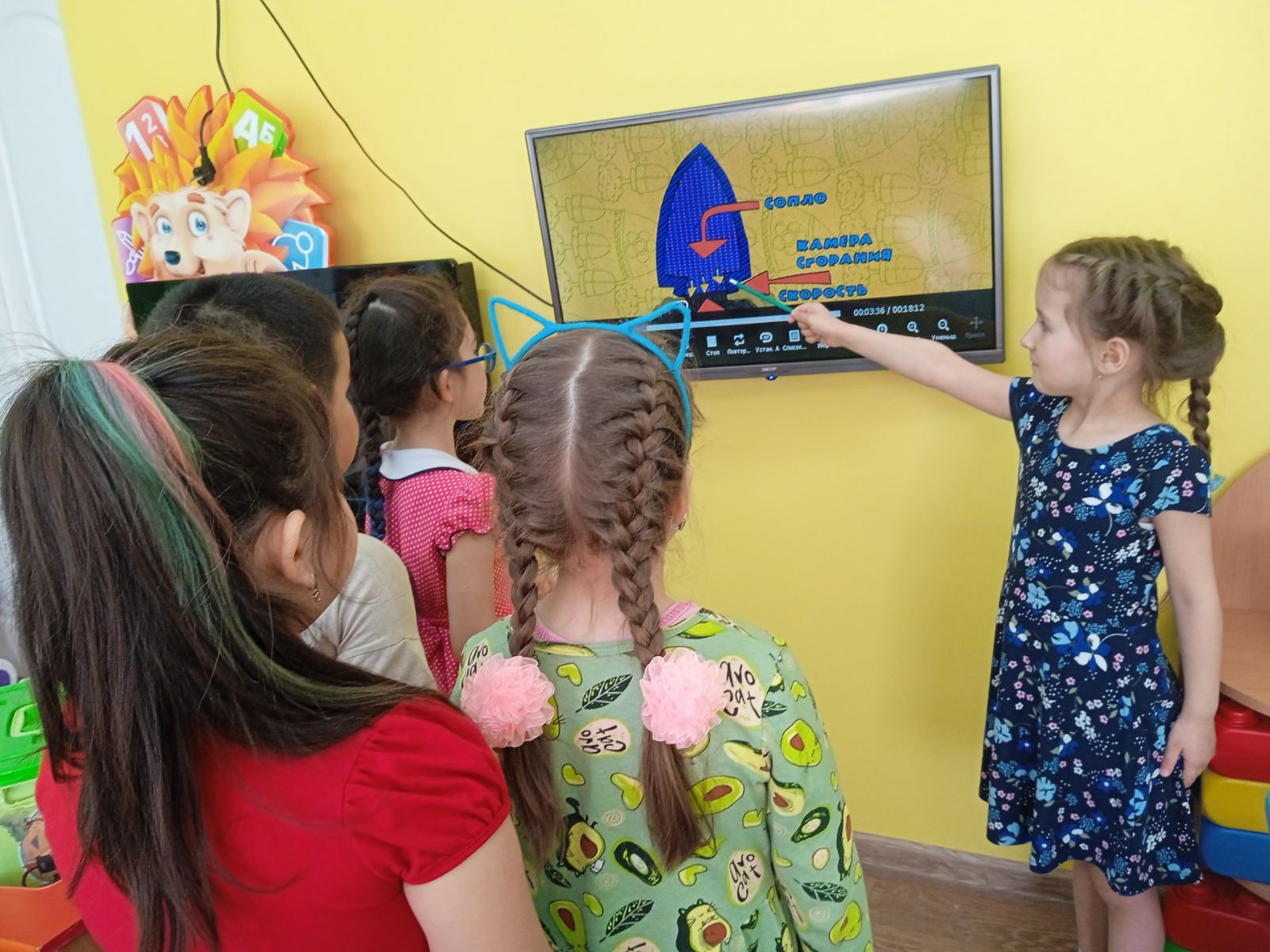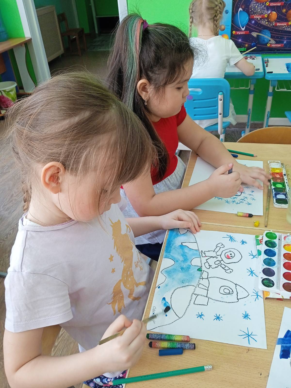 Узнали составные части ракеты: корпус, нос ракеты, ступени. Закрыв глаза, ребята на миг представили себя в космосе и все свои воображения и фантазии воплотили в своих рисунках.