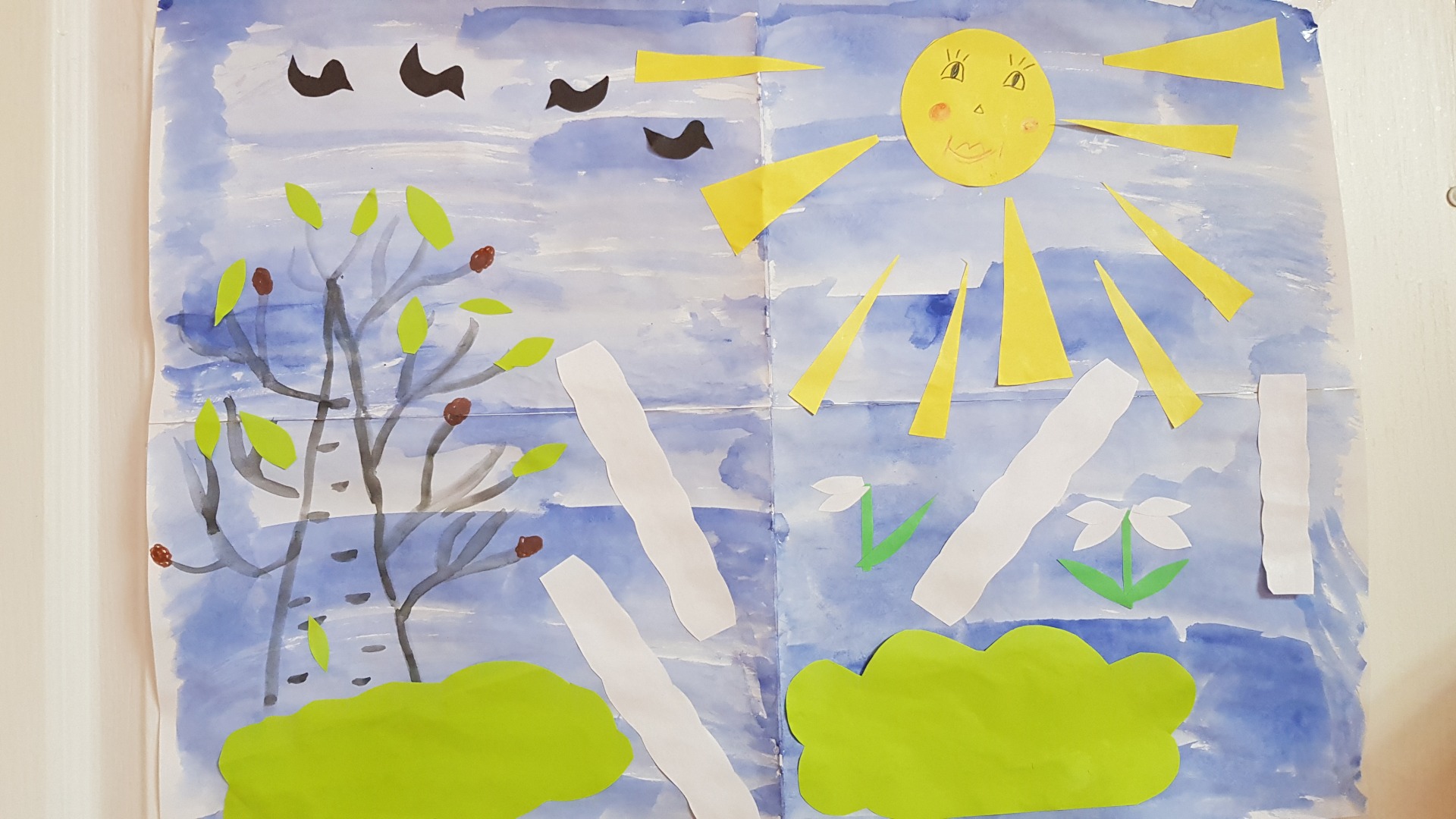 В ходе наблюдения на прогулке и чтение произведении о весне, дети отобразили свой впечатления и знания в коллективной работе «Весна»