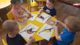 С наступлением весны, тематика образовательной деятельности в младших группах связана с пробуждением природы (с живой и не живой природой), так мы в группе « Горошинка» и « Улыбка», простились с зимующими птицами снегирём и синицей, уточнили с детьми, что эти птицы на время улетают в близлежащие леса, сады и парки. Там, среди зелени листвы в укромных местах они будут вить гнёзда.