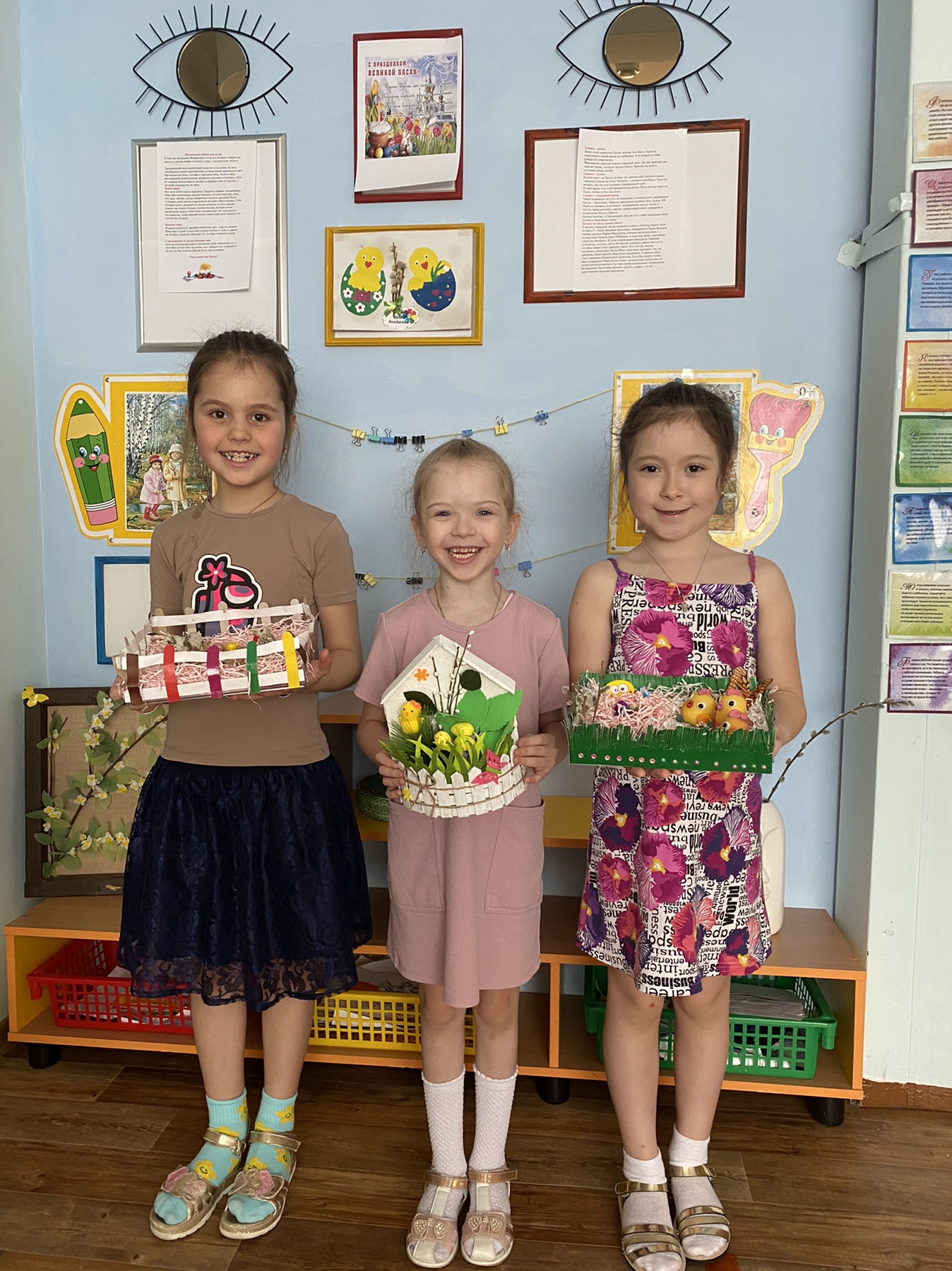 Куличи, яйца, пасхальные корзиночки, верба и множество других символов древнего христианского праздника присутствуют в красочных аппликациях и поделках, выполненных детьми.