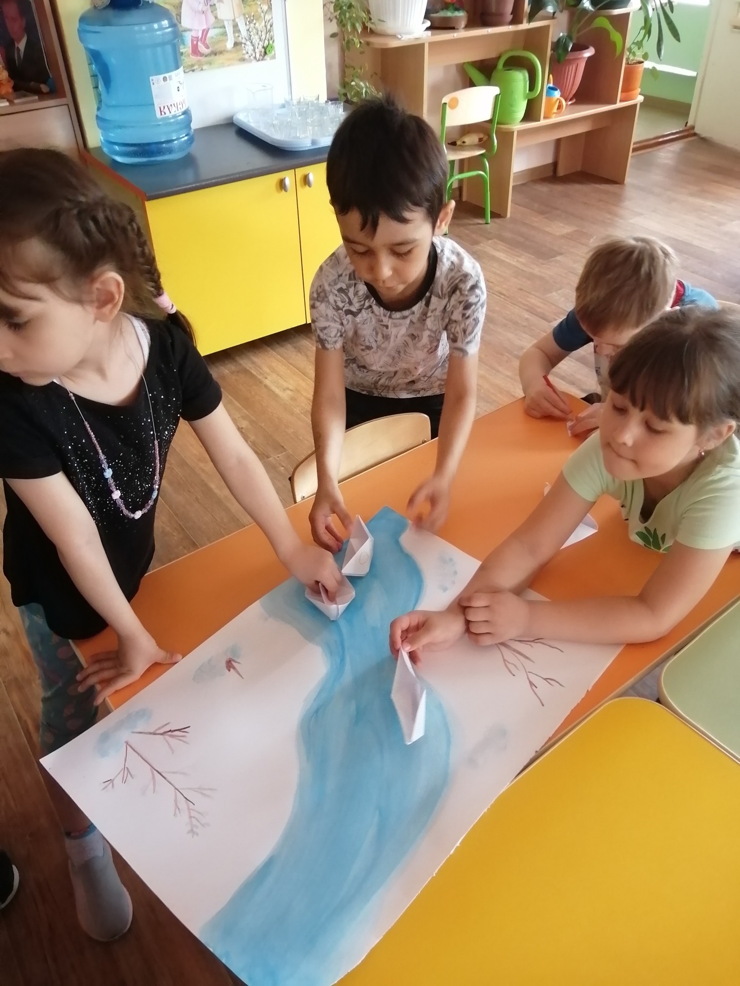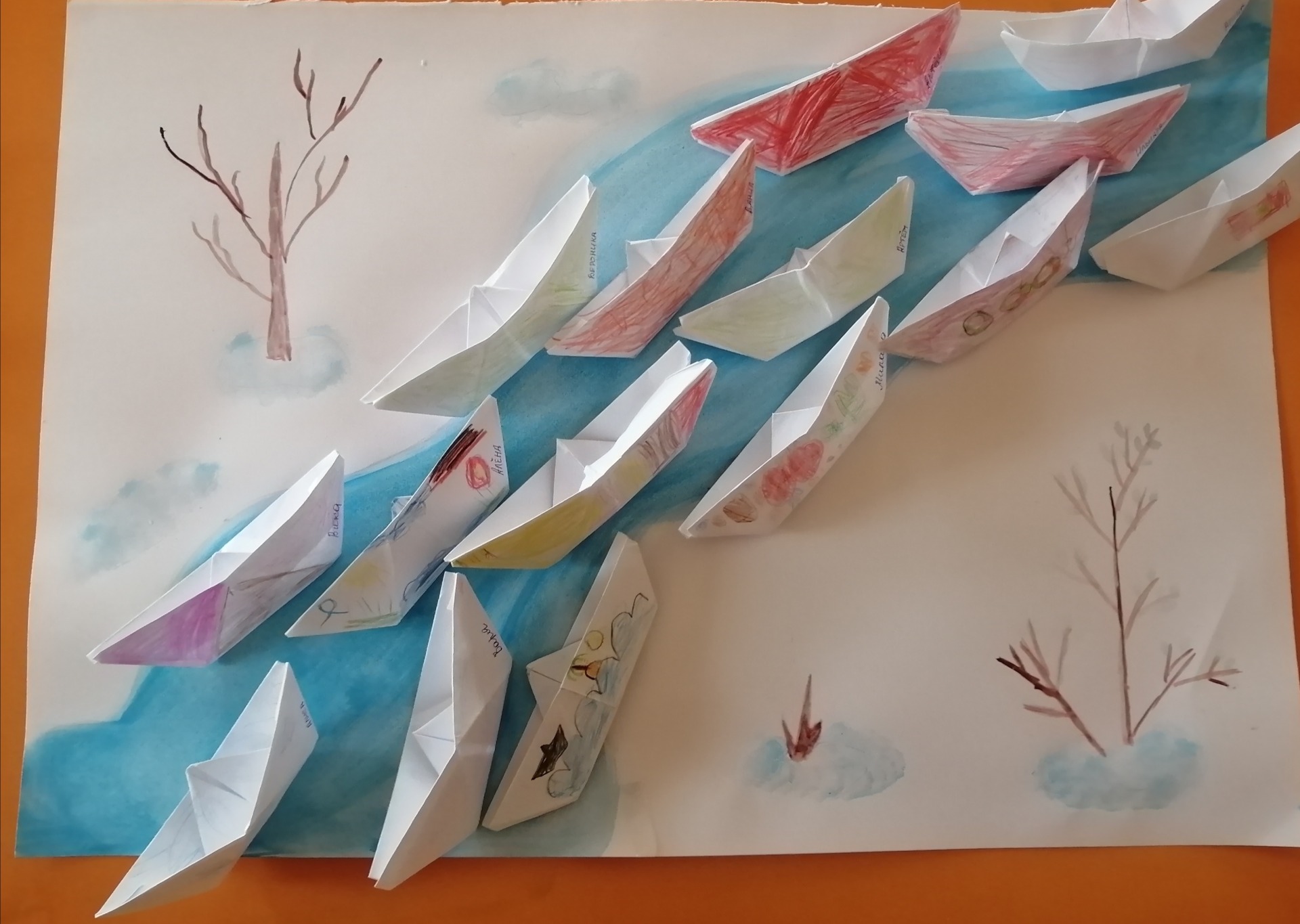 А ещё с удовольствием создали коллективную картину в технике оригами на тему: «Кораблик».