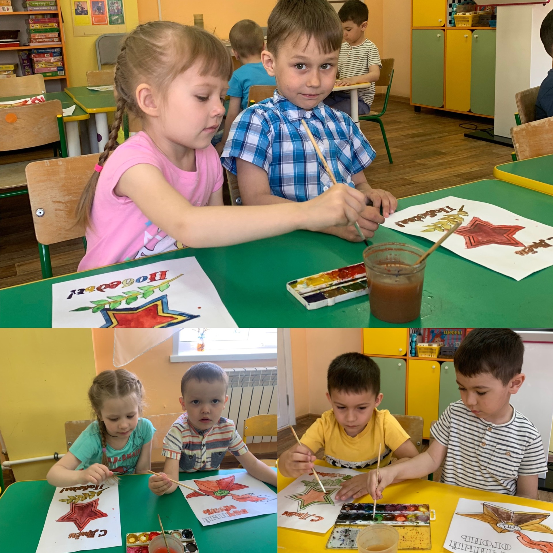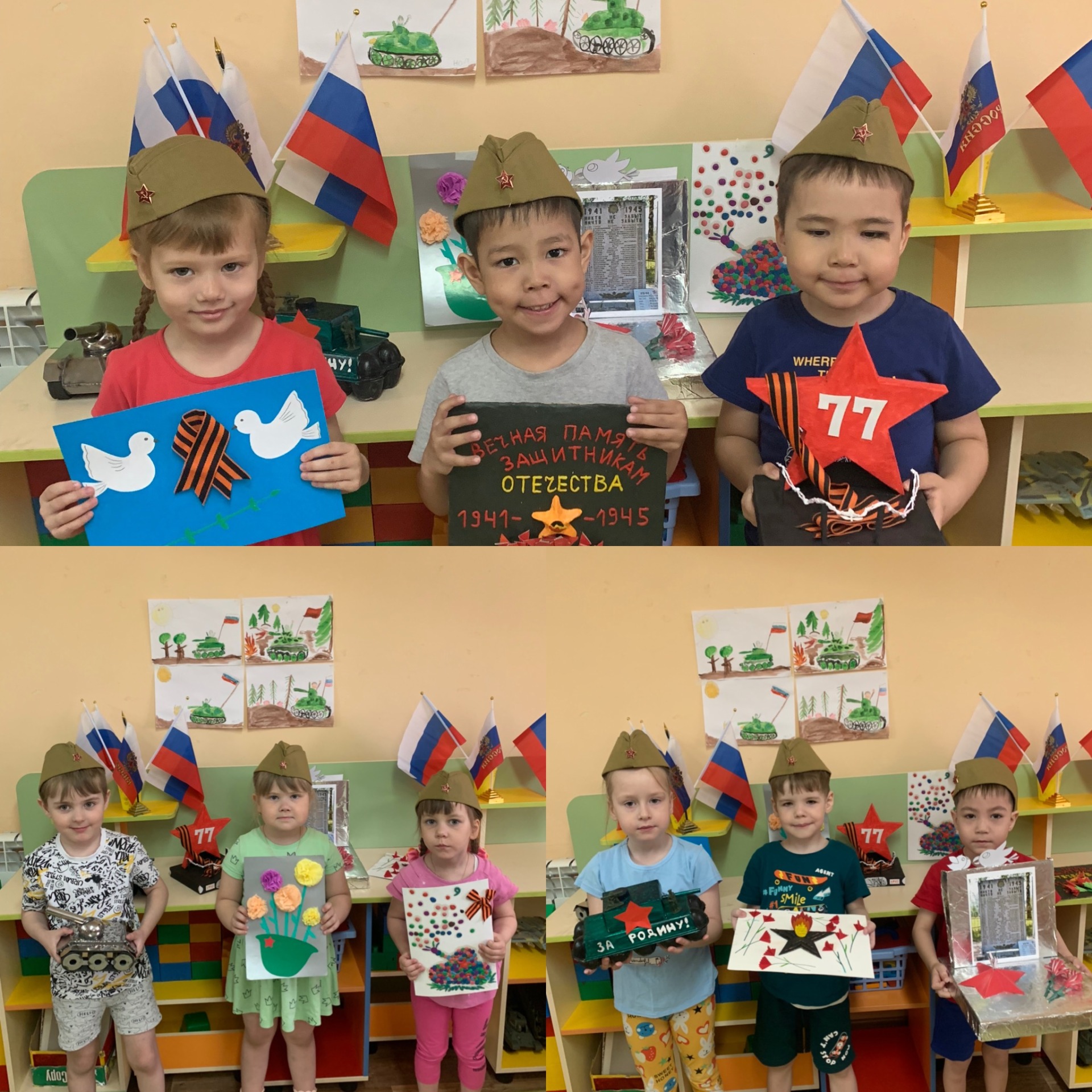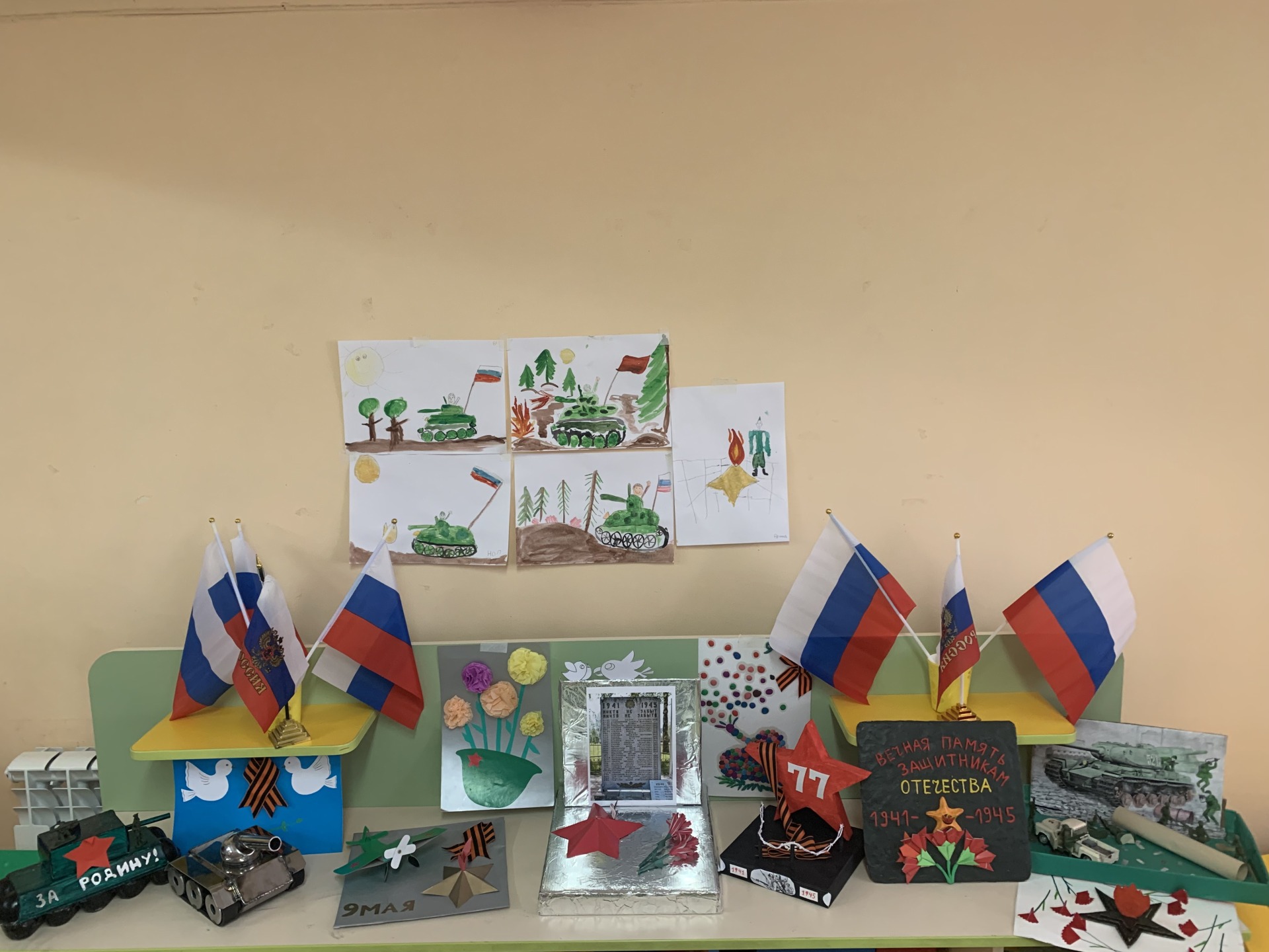 Дети вместе с родителями оформили выставку поделок и рисунков на тему «День Победы».