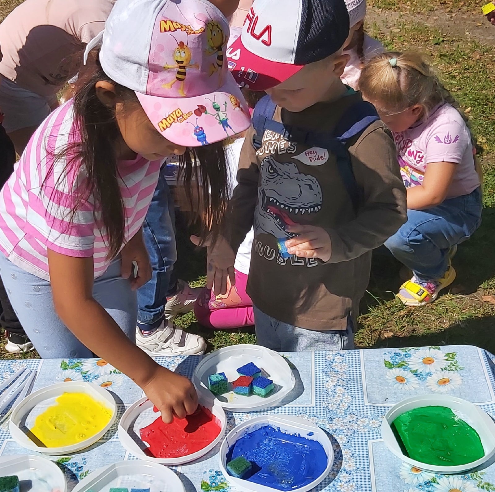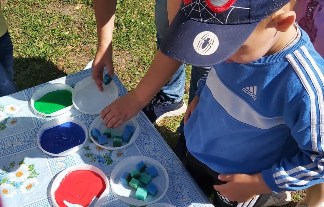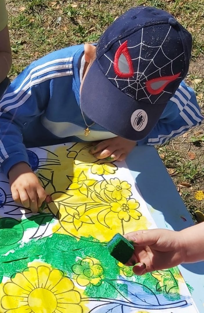 На прогулке обратились бабочки с просьбой добавить красок на цветочную поляну. Ребята с удовольствием принялись за работу, используя нетрадиционное рисование: с помощью поролоновой губки и гуашевых красок. Благодаря жаркому солнцу и легкому ветерку, краски быстро высохли и бабочки смогли насладиться прогулкой на яркой и разноцветной цветочной поляне.