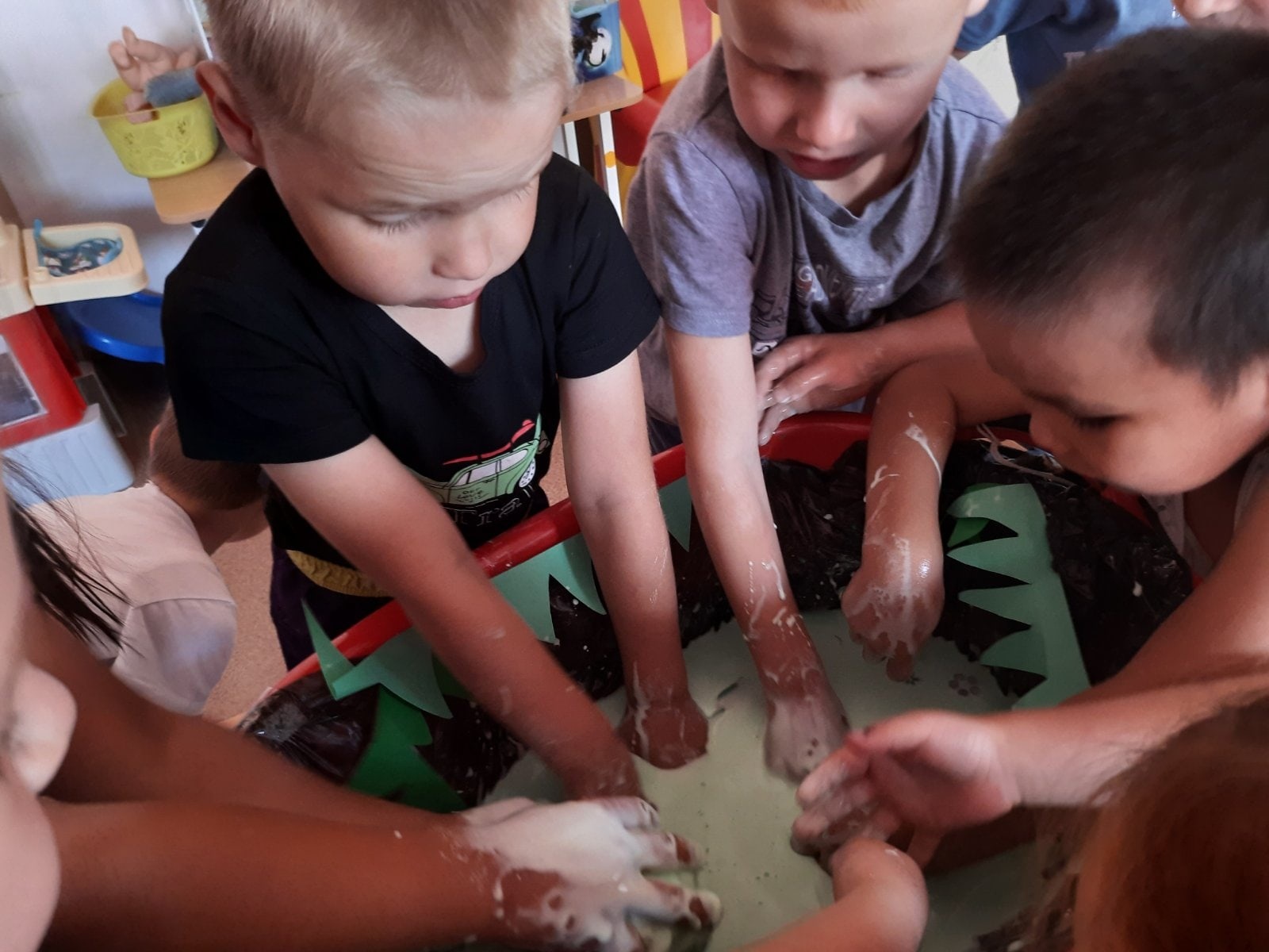 Ребята не только смогли увидеть маленькое болото (эксперимент с крахмалом водой и красками), но и ощутить руками вязкость экспериментальной жидкости.