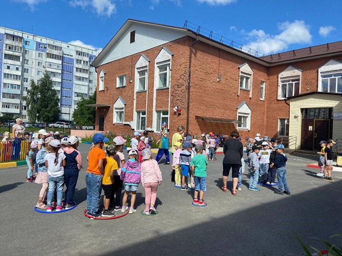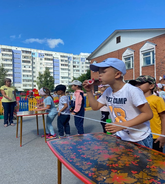 В теплый и солнечный день ребят встретила веселая Смешинка с мыльными пузырями. Они играли с детьми в подвижные игры: «Поймай мыльный пузырь», «Самый большой мыльный пузырь», «Чей пузырь перелетит через веревочку», загадывали загадки, танцевал