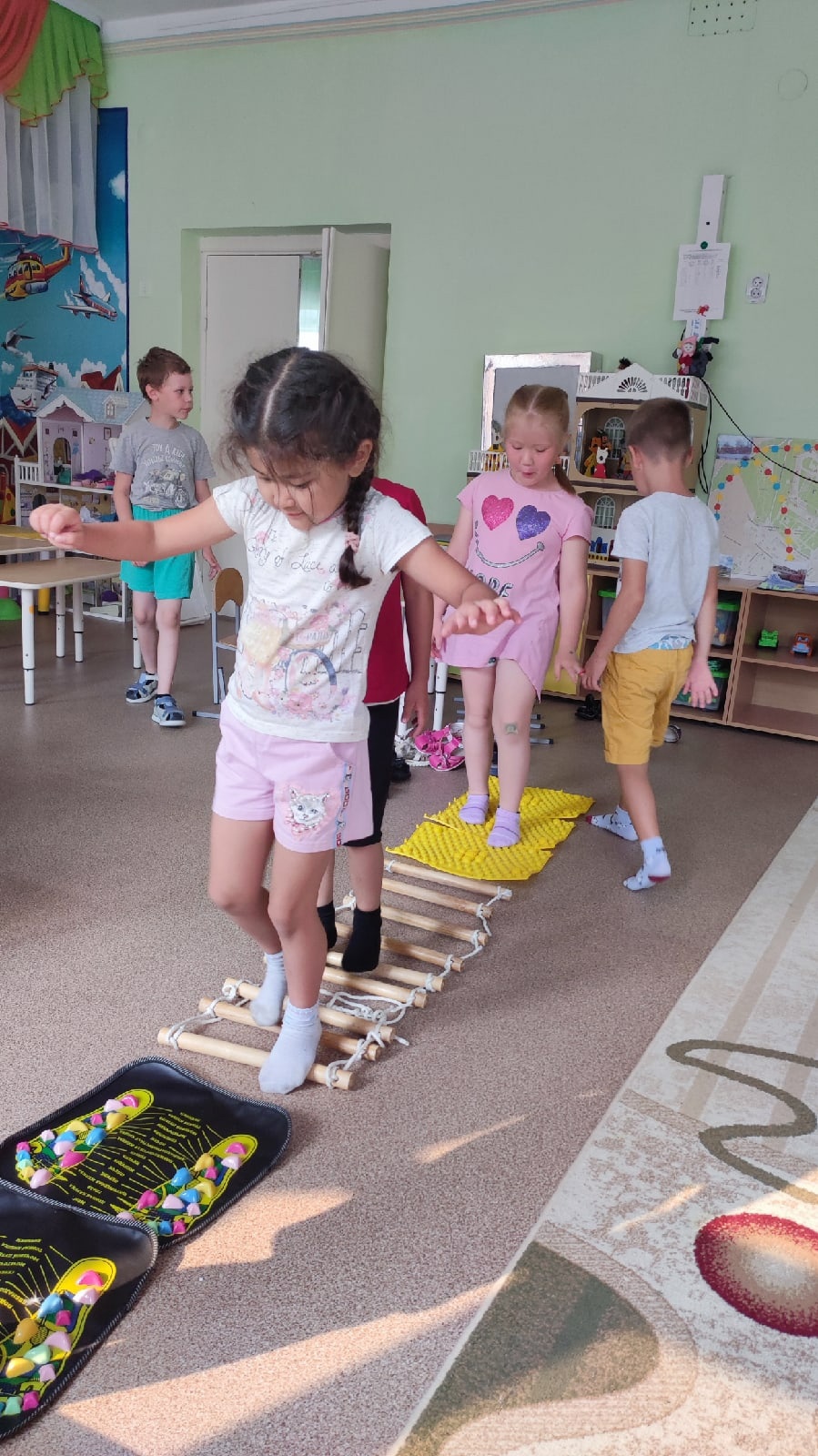 Дневная прогулка сочетается с подвижными играми, физическими упражнениями и закаливающими процедурами (воздушные и солнечные ванны, хождение по закаливающим дорожкам).