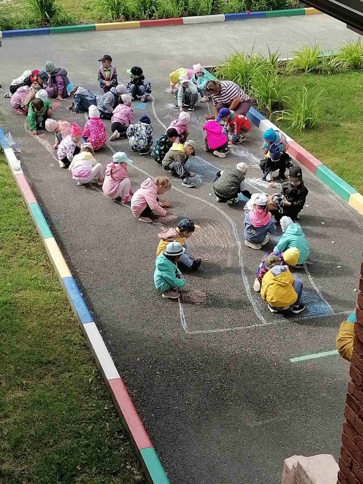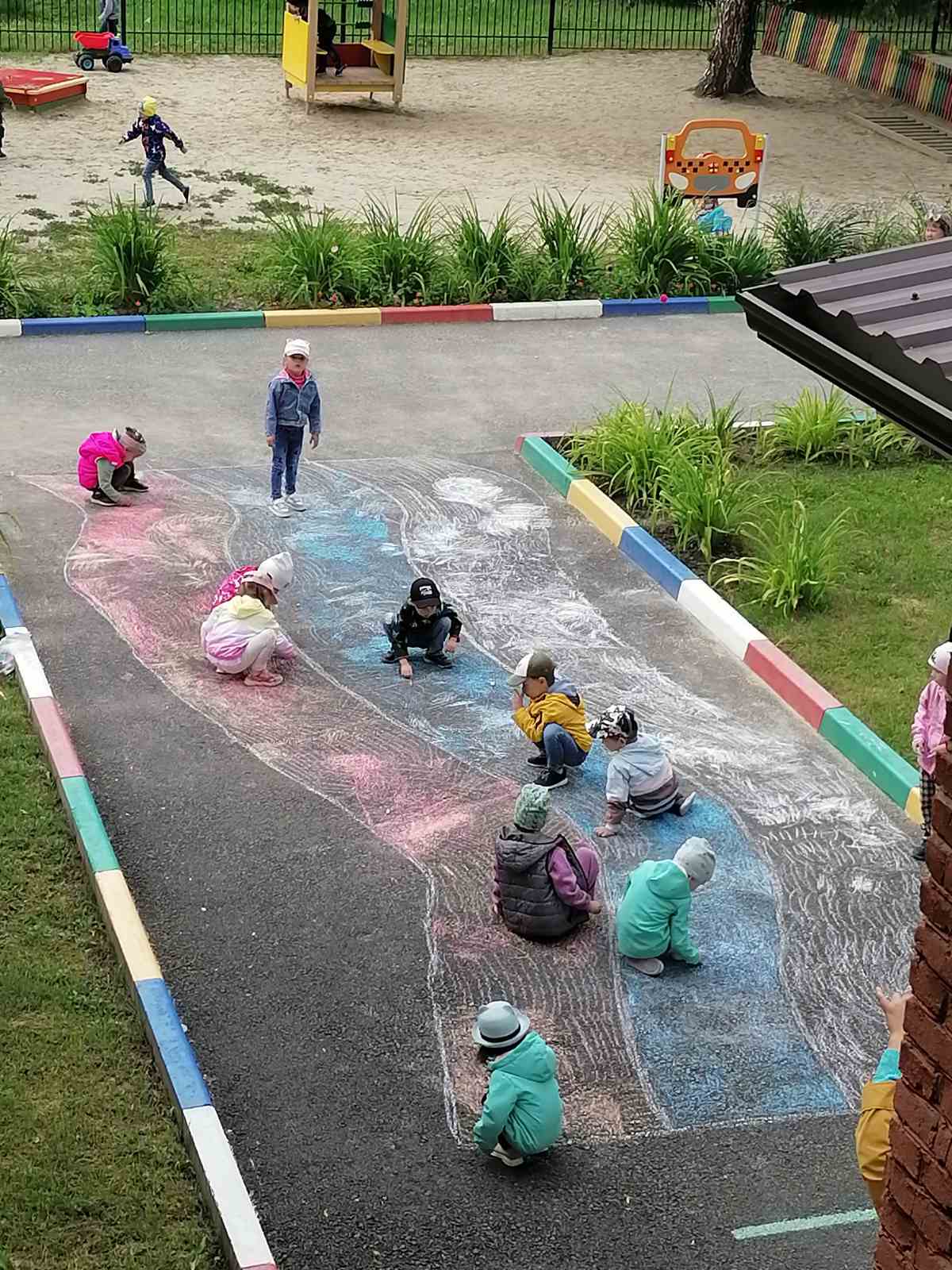 Участвуя в акции "Вместе мы сила!", у каждого ребенка была возможность внести частичку добра, любви и гордости при разукрашивании гигантского флага на асфальте.