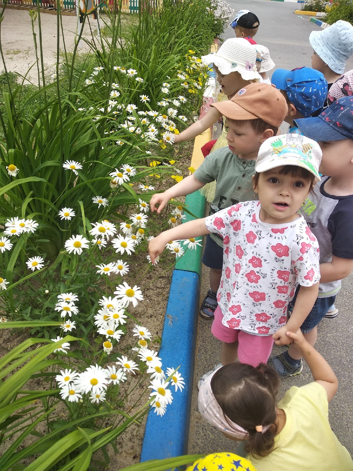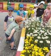 Во время экскурсии вокруг садика дети из группы "Цыплята" любовались цветами на клумбах, наблюдали за пчелой. Находили, узнавали и называли знакомые цветы: ромашка, бархатцы. Показывали части ромашки: стебель, листья, цветок. Дети знают, что рвать цветы нельзя, они растут для красоты.