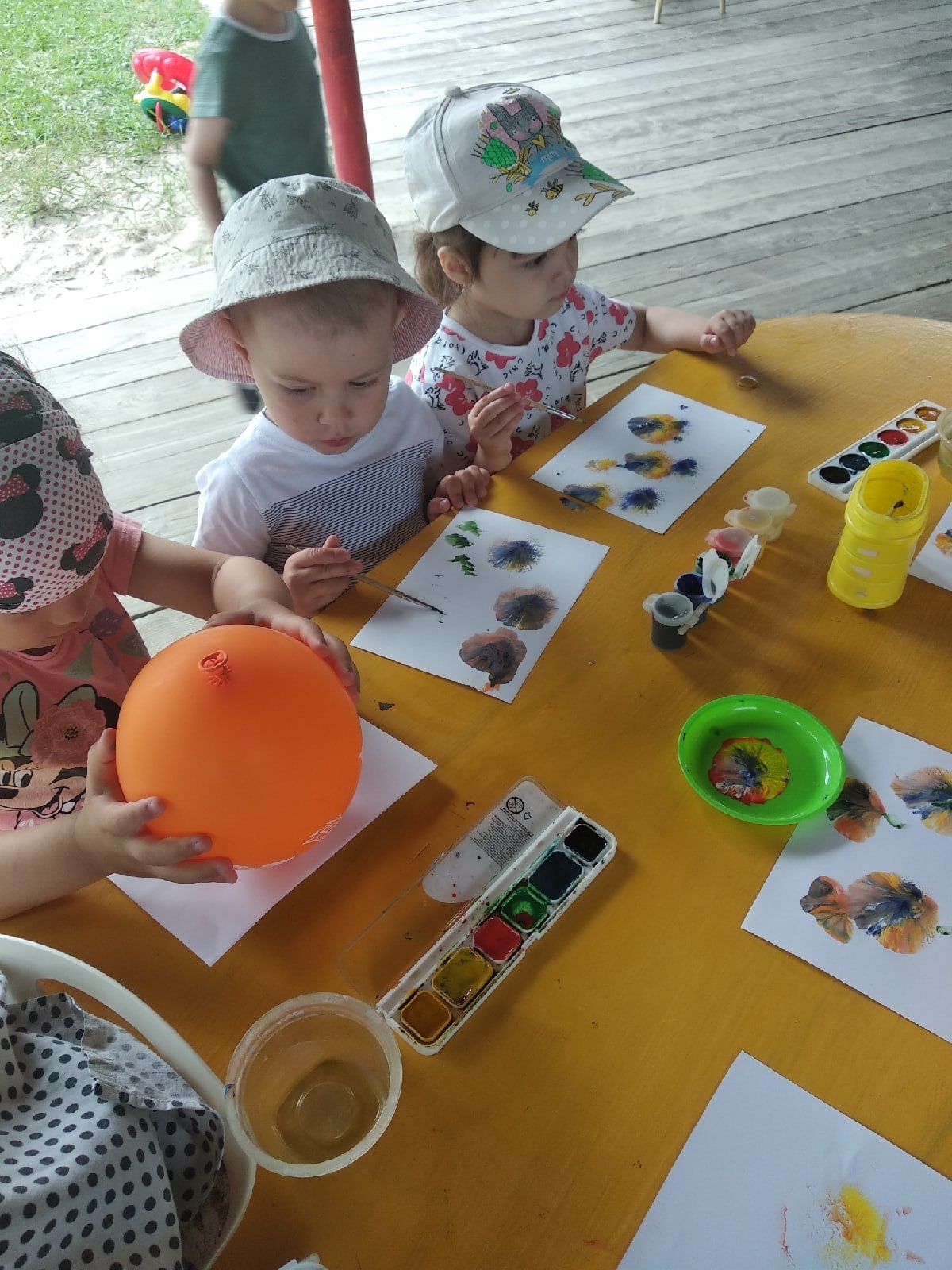 Свои впечатления дети отображали в продуктивной деятельности. Рисовали цветы при помощи красок и отпечатком шара , наклеивали ромашки на лужок.