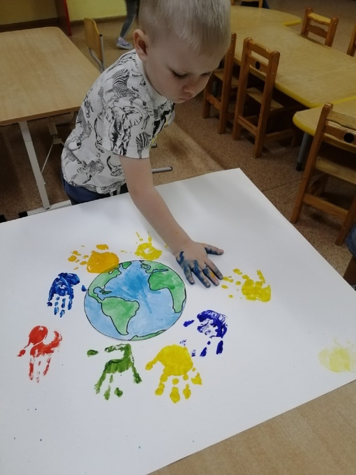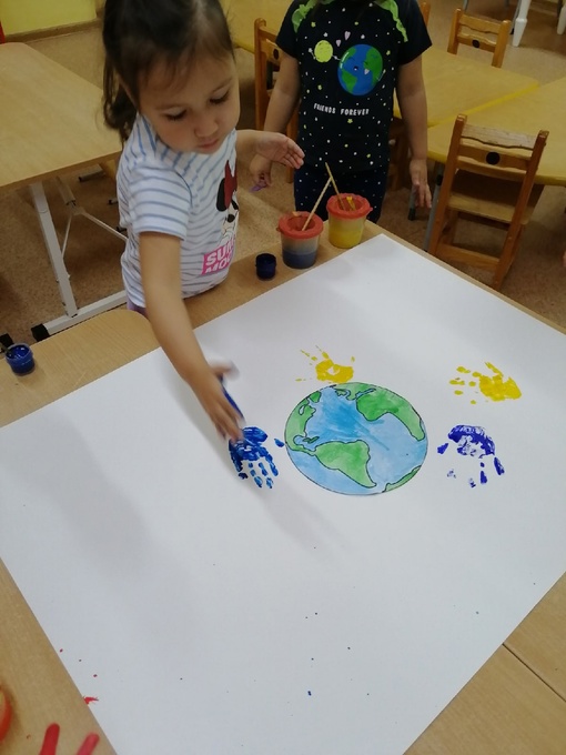 Рисовали ладошками коллективную работу "Мир на планете".