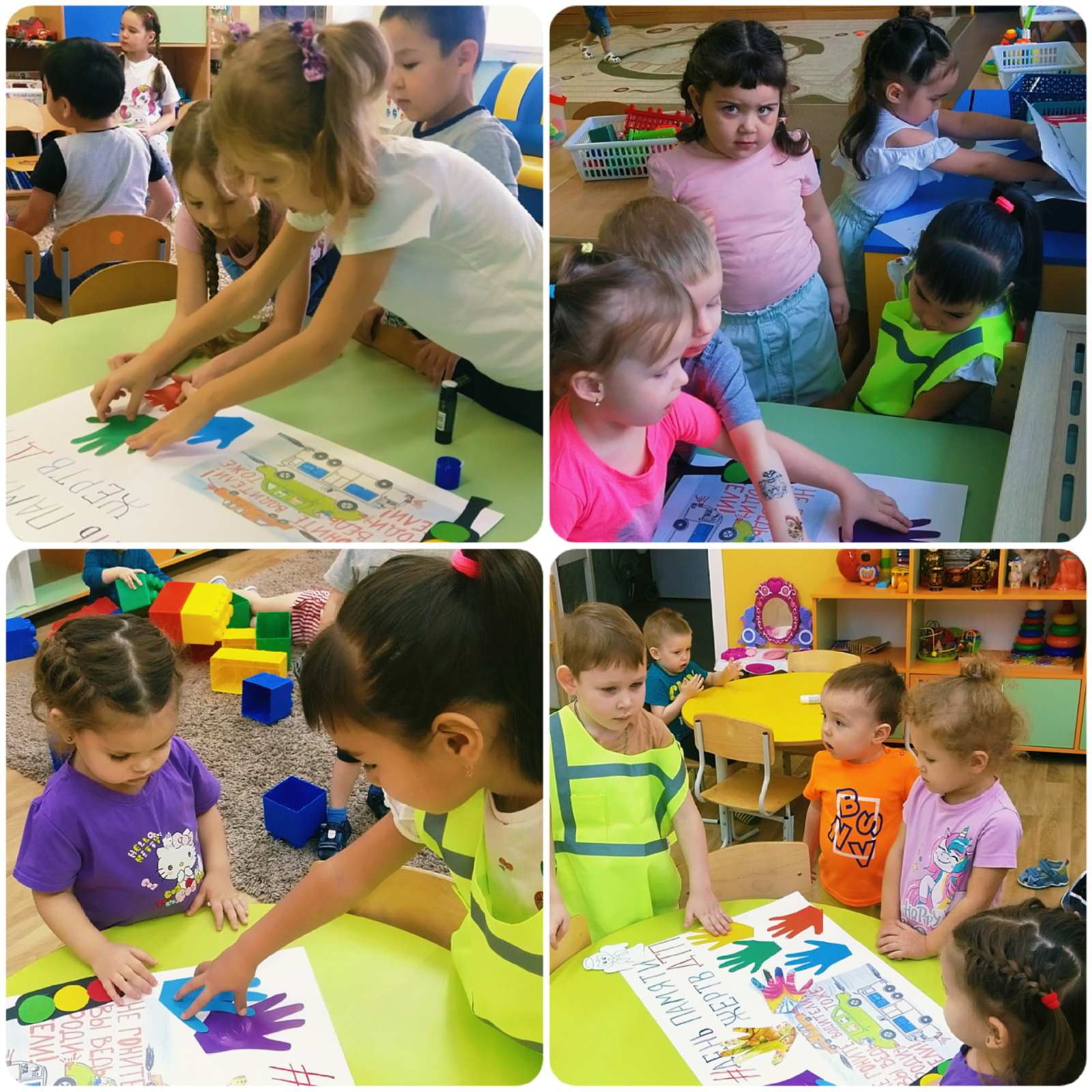 В завершение мы создали мини-стенгазету, а также посетили другие группы детского сада, ребята из групп «Незабудка», «Дюймовочка» и «Крепыш» приклеили свои ладошки и тоже поучаствовали в акции!