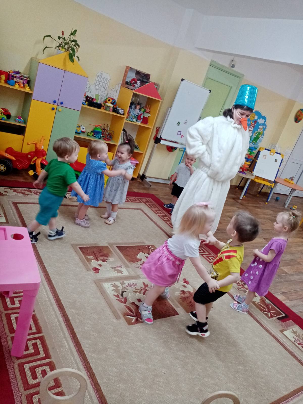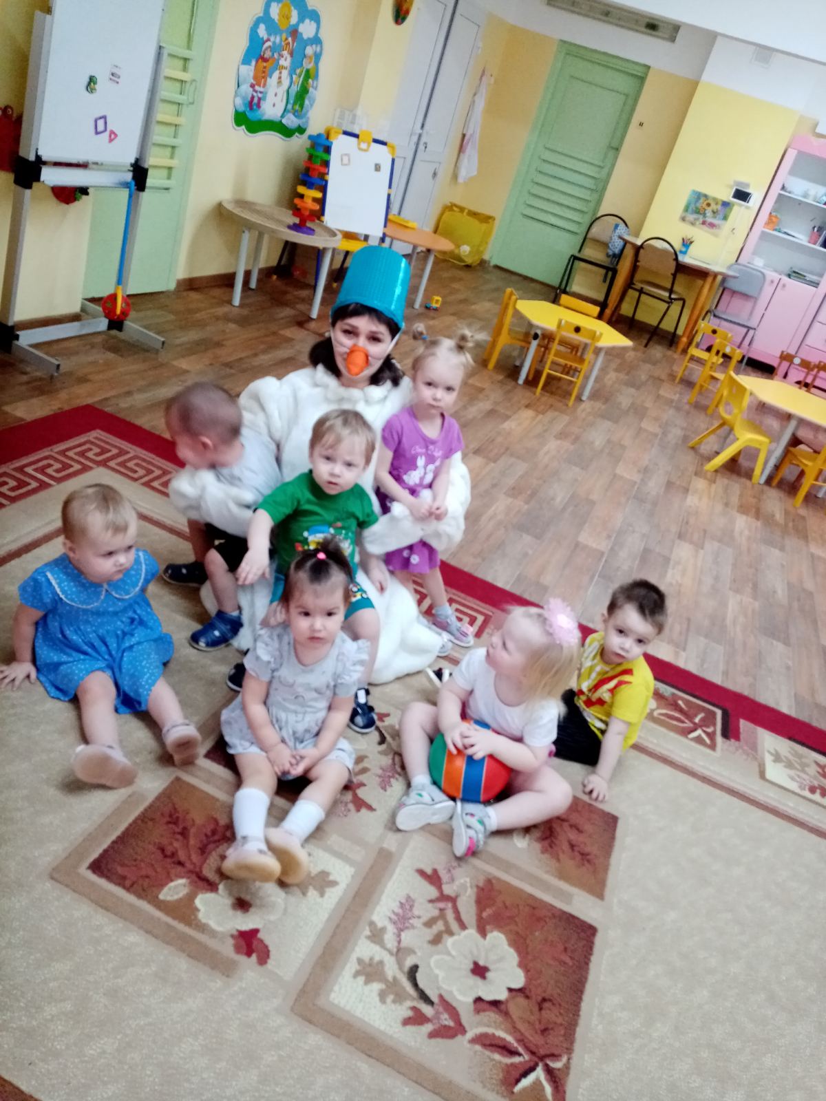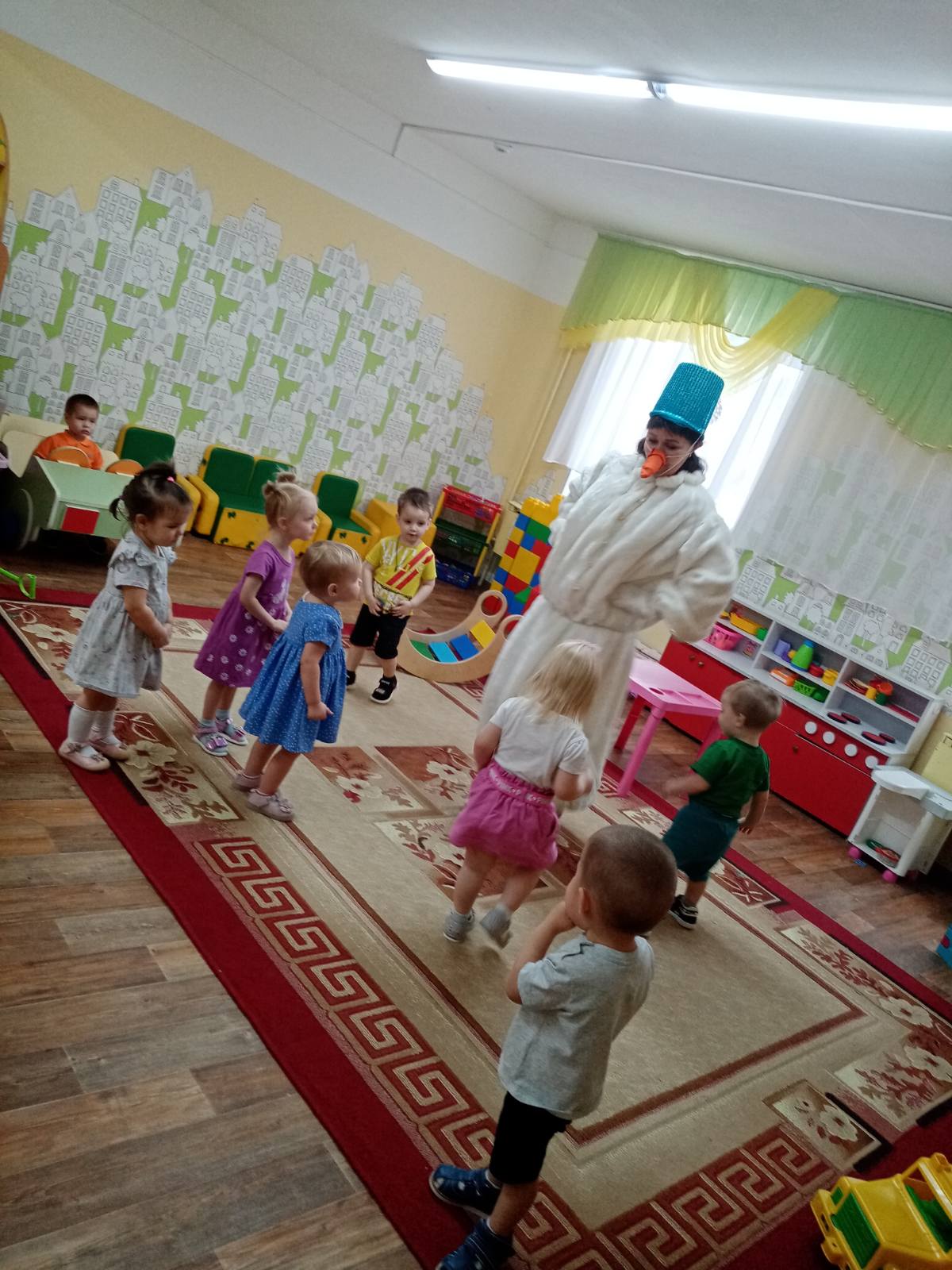 И так, в группу "Улыбка" пришёл в гости Главный герой. Снеговик пришёл не с пустыми руками, он приготовил для малышей много весёлых игр, песен, танцев. Малыши были в полном восторге и подарили подарки для Снеговика.
