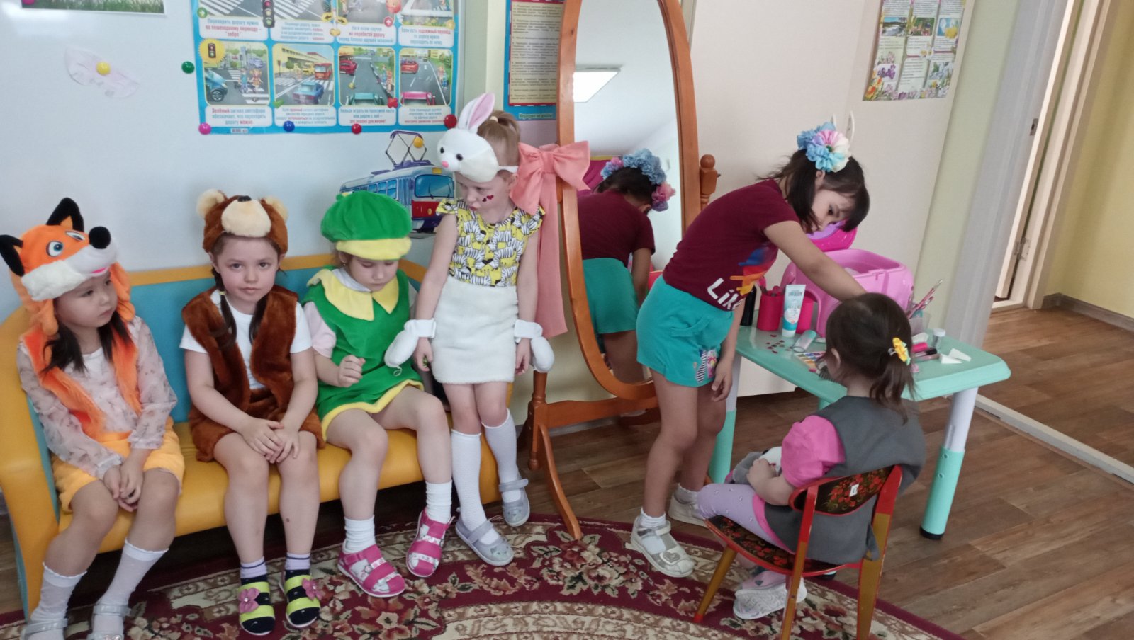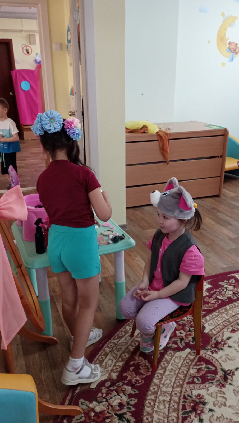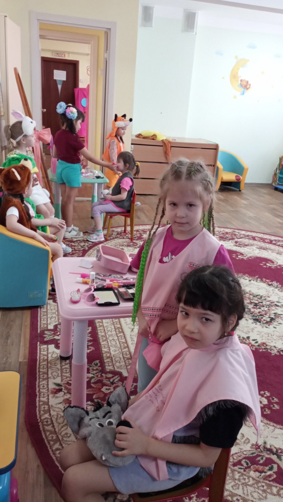 Строители быстро взялись за работу и начали строить, а артисты посетили Арт-студию «Маленькие солнышки», где гримеры приготовили их к выступлению в театре, наложили Гримм и сделали прически.