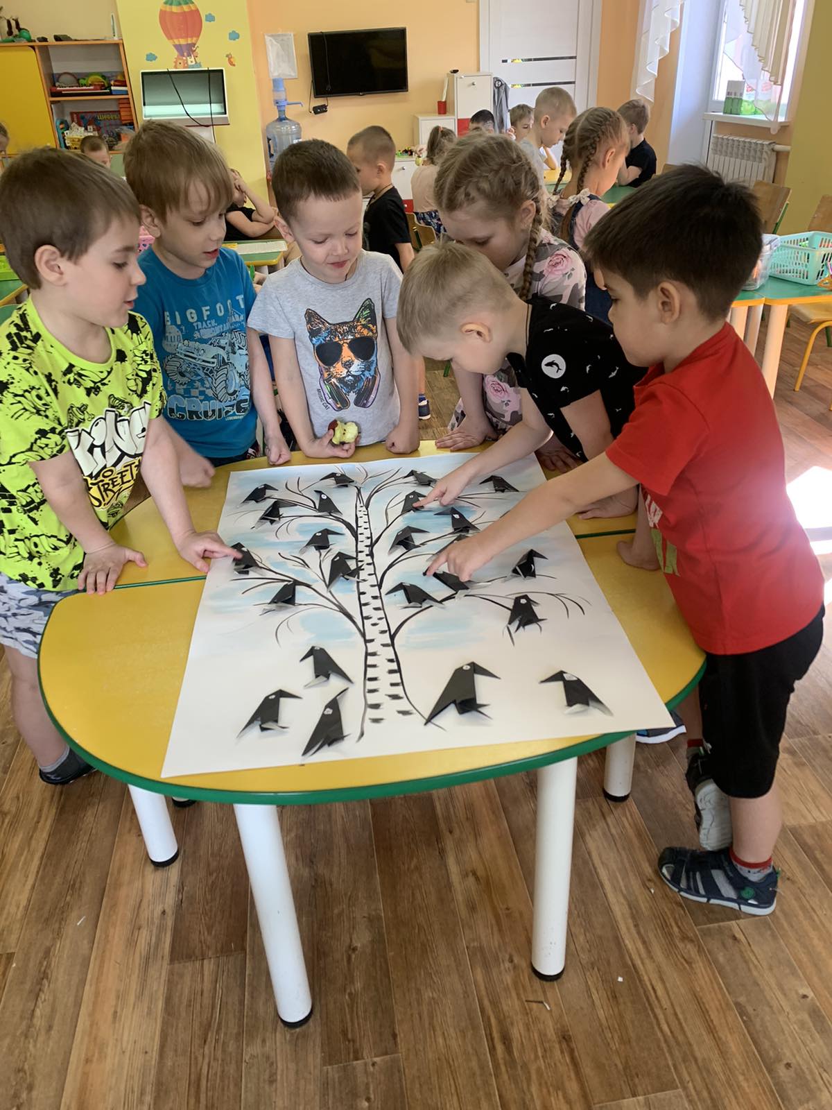 Поскольку грачи гнездятся большими семьями, мы объединили их в одну большую коллективную работу «Грачи прилетели».