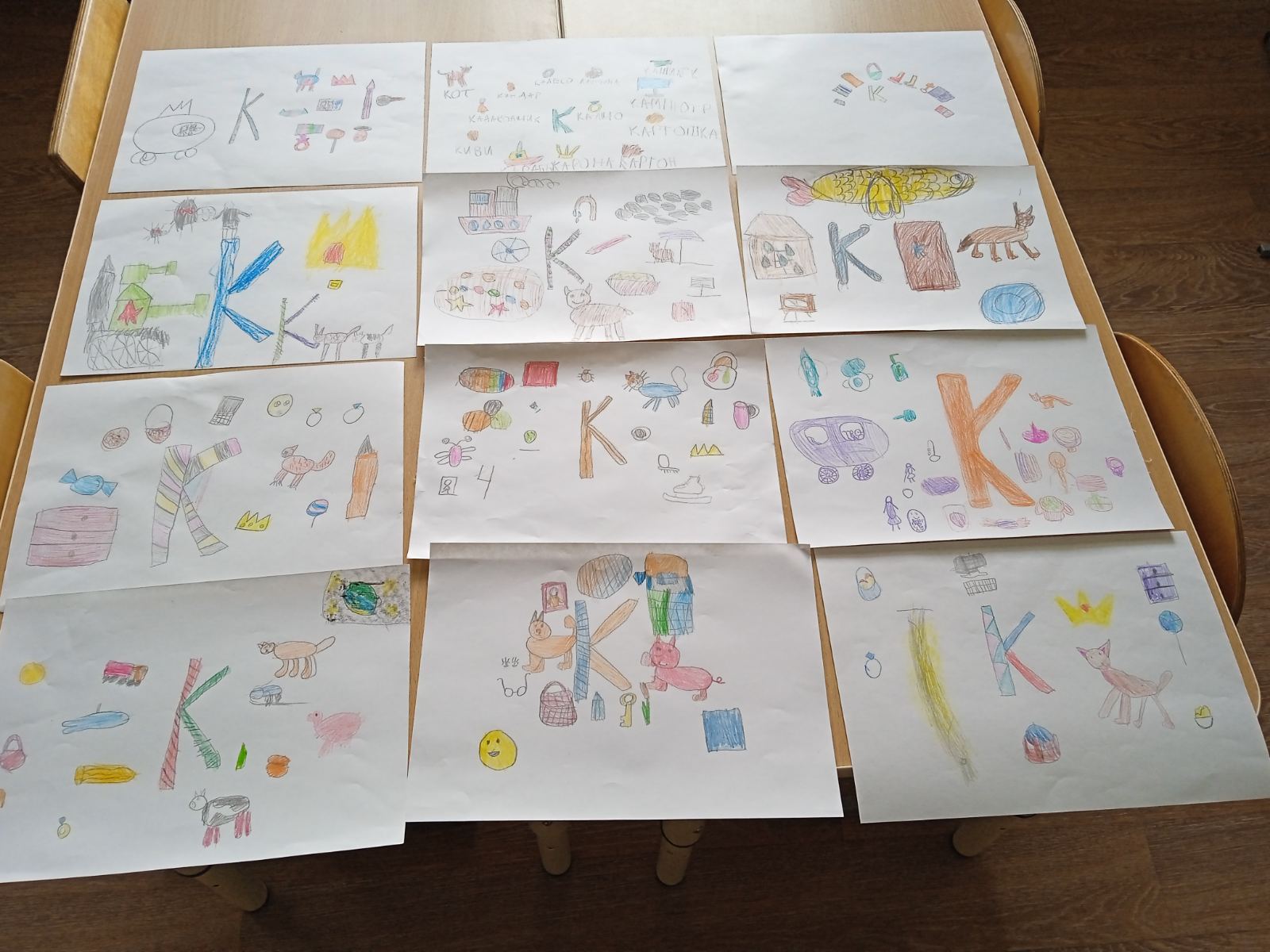 В продуктивной деятельности ребята с увлечением рисовали букву «К» и предметы вокруг неё, в названии которых есть этот звук. Рассказывая о своём рисунке и слушая рассказы других, ребенок снова закреплял умение внятно и отчетливо произносить слова с заданным звуком, развивая связную речь.