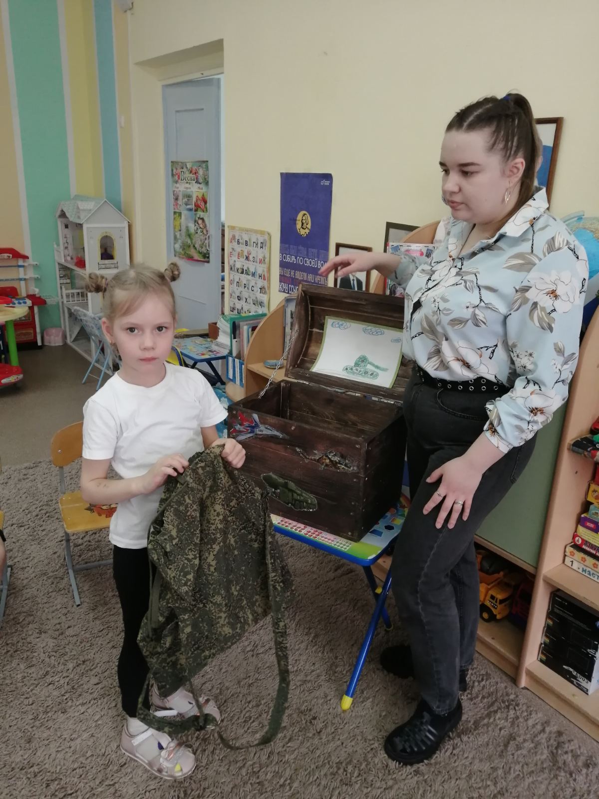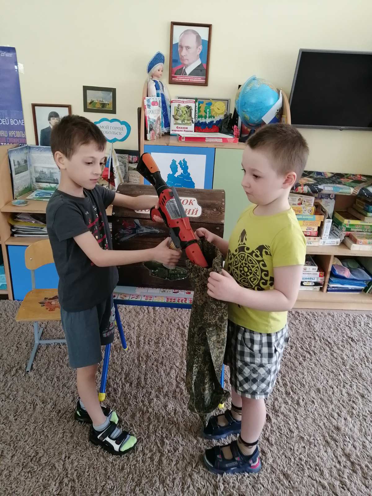 Следующим заданием был военный мешок, нужно было на ощупь определить военную технику. И с этим заданием дети справились.